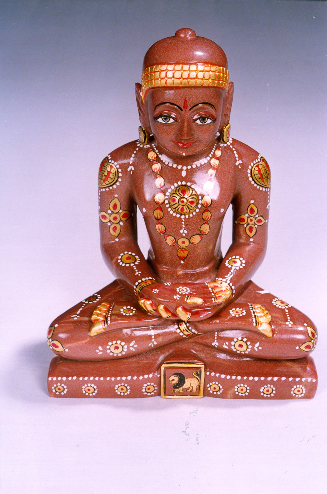 A divine and ornate statue with careful use of gold, very well balanced with red on a brown canvas. Accented with black on the designs as well as the facial features. Beautiful eye lashes a red "Tilak" and nice lips. A fine statue for the distinct collector.