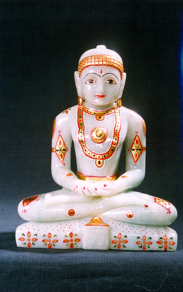 An extraordinary greenish white statue sprinkled with gold and red. Beautifully highlighted with gold and red ornaments all over. The small polka dots give a feeling of elevation to the idol. Calm and composed expressions add poise to this brilliant piece of art.