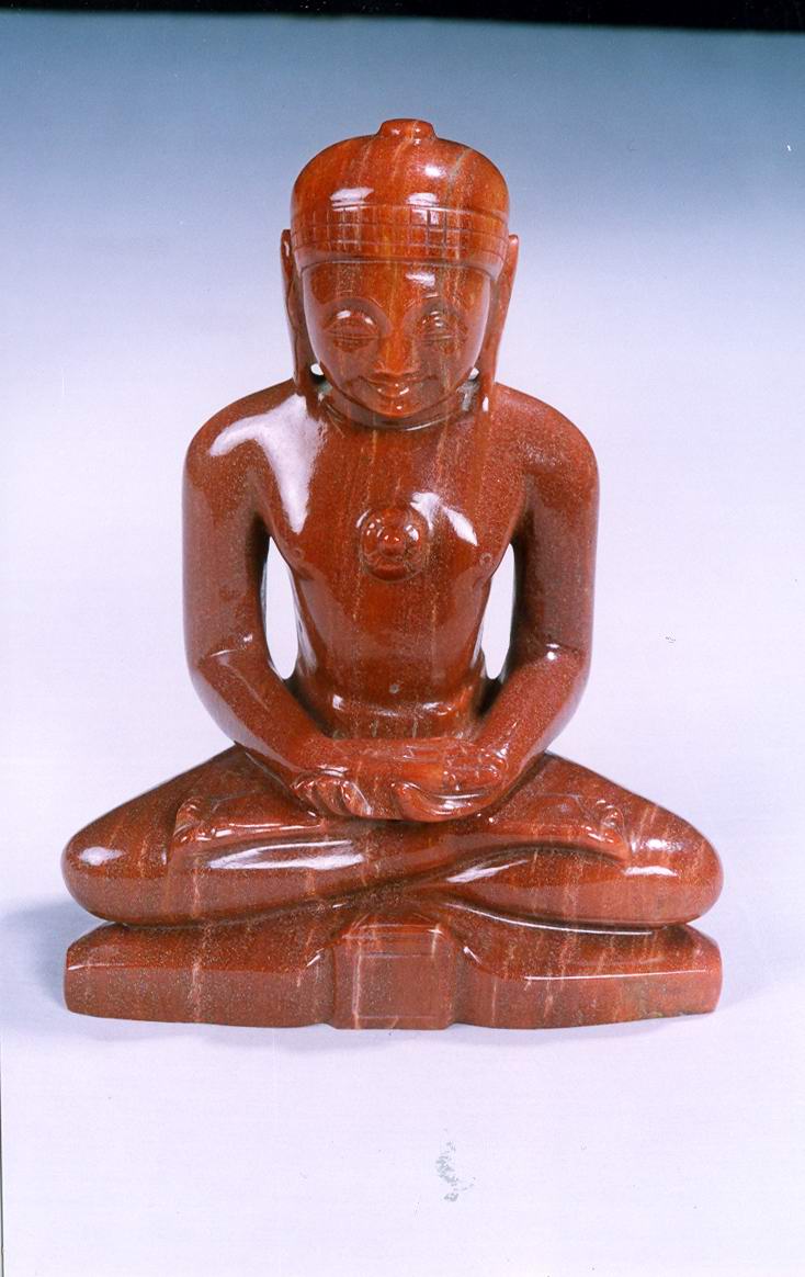 A beautiful "Tirthankar" idol carving in "Padmasan" posture in brown with orangish red vertical lines. Calm and poised expressions with well-balanced carved limbs, a very fine chiseled face and a feeling of grandeurs is lent from the "Sinhasan" platform. High luster polish and the red orange emission of radiating light add a touch of serenity and purity.