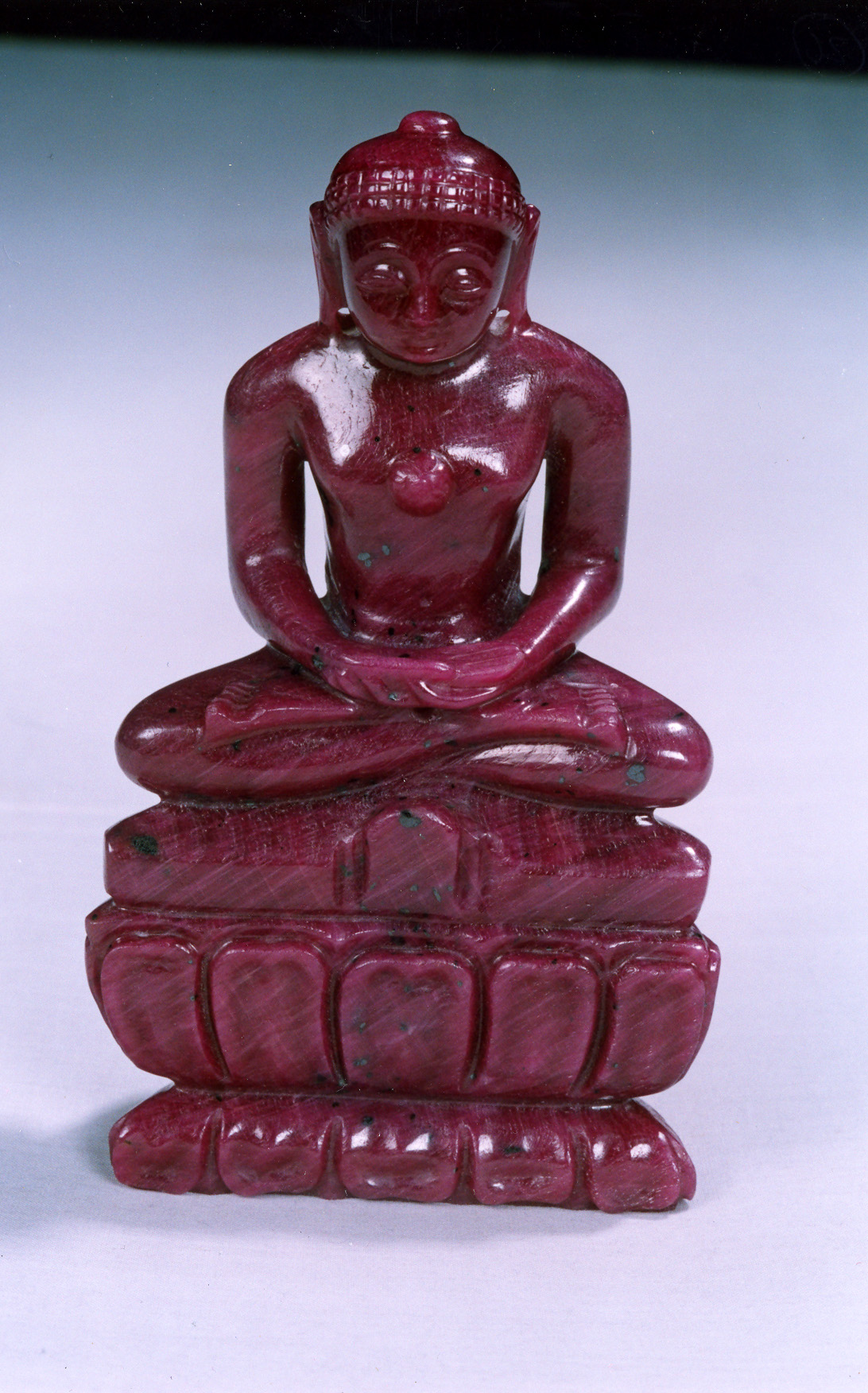 An enormous and stunning "Tirthankar" idol statue in the color of love. Vivacity, power and passion. Feeling of elevation and divinity lent by the stunning height of the "Sinhasan" double lotus platform. Graceful and poised facial expressions add radiance to the statue. Perfect "Padmasan" posture carved in the second hardest gemstone on earth makes this a connoisseur piece.