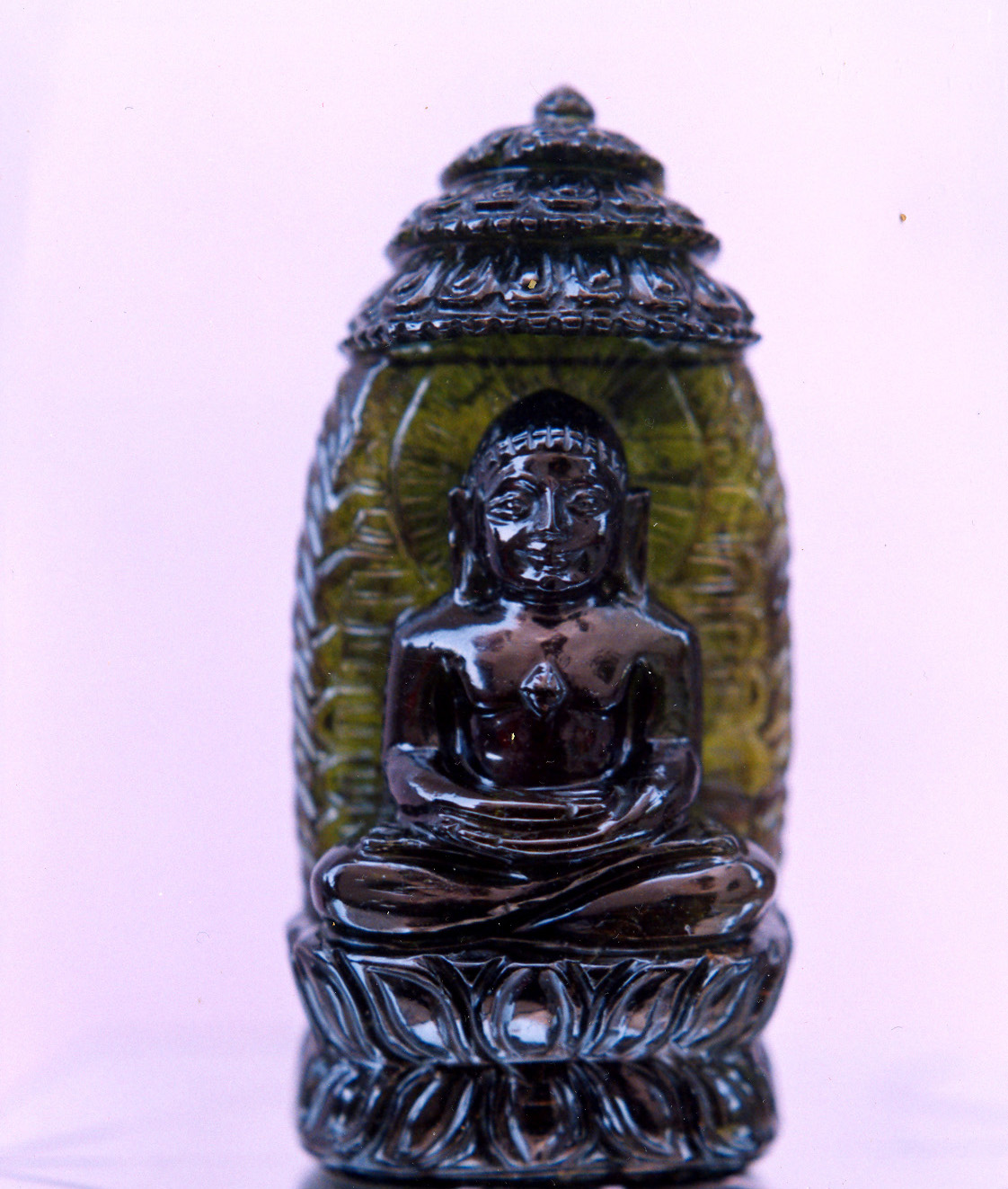 A luxurious "Tirthankar" statue is seated on a lotus design platform while a "Chattra" provides shade and grace to the statue. Remarkable minute details in the background have been shown. The "Abhamandal' halo around the head symbolizes highest purity. A lighter background gushes the main idol to the forefront. A stunning piece of art in the miraculous stone called tourmaline.