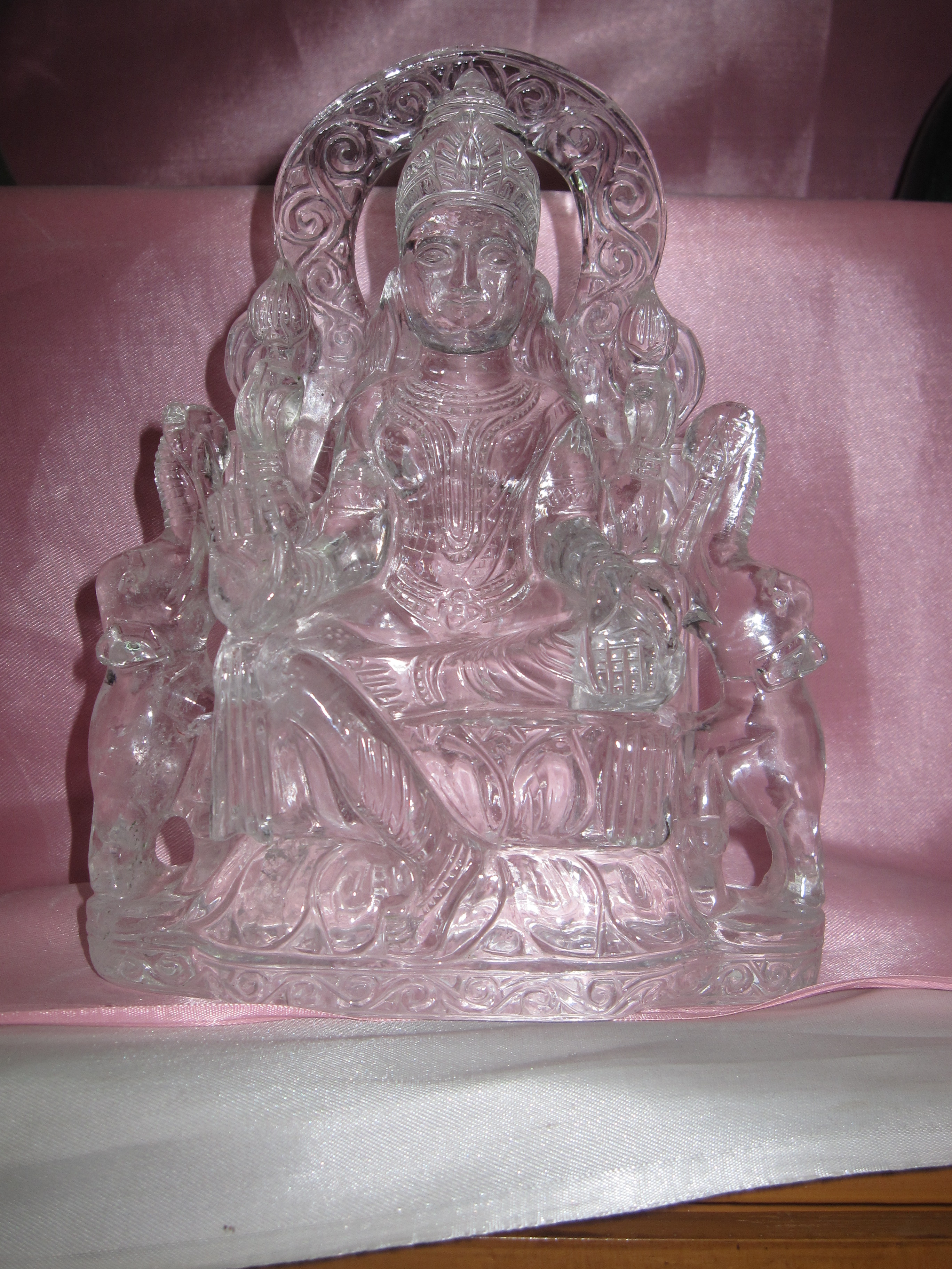 A flawless and pure crystal idol of Goddess Laxmi carved beautifully by the lapidary. Exquisite lotus pedestal together with classy proportions of the body make this a connoisseur’s piece.