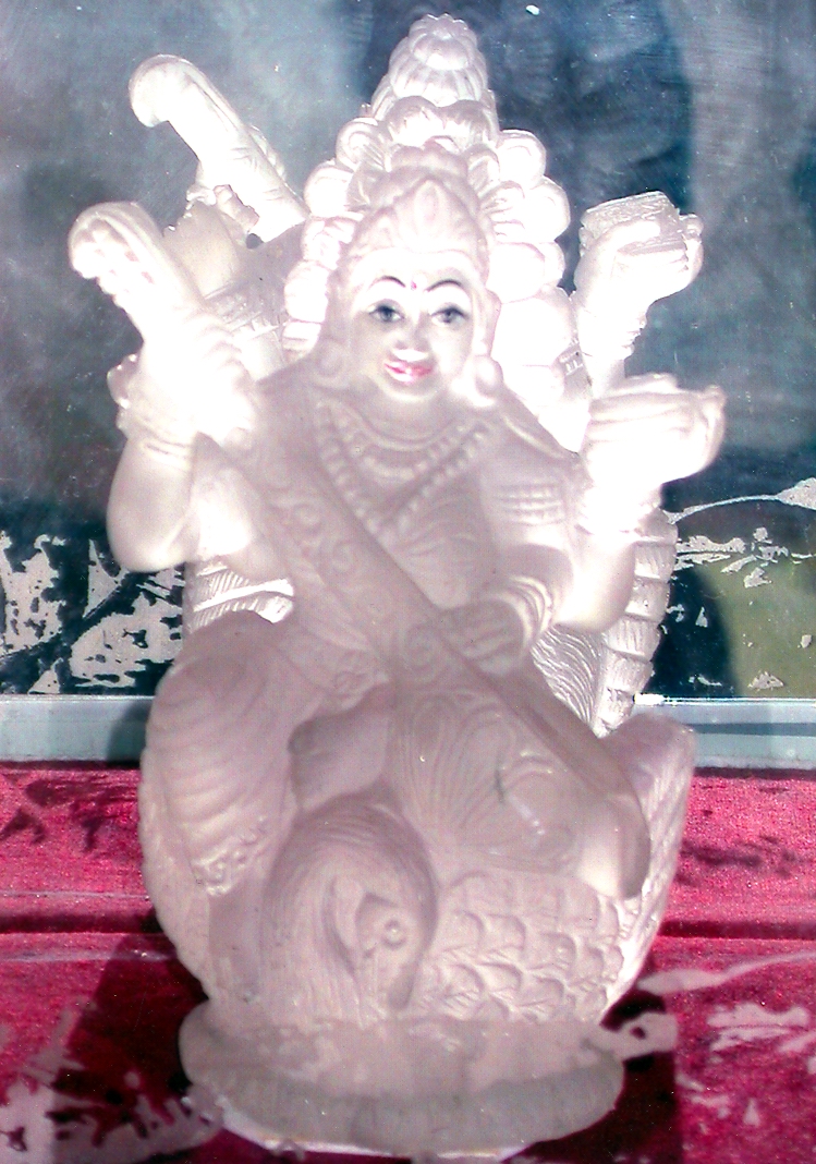 The Indian goddess of Knowledge, Saraswati carved out of single clear crystal quartz. Beautifully carved "veena" being held by the goddess seated comfortably on a swan.