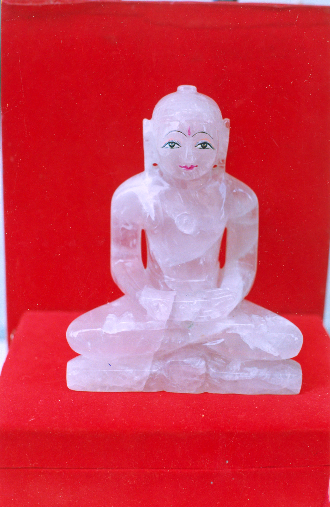 A glamorous "Pujyaniya" Tirthankar statue in the soothing and calm baby pink color of rose quartz. The fine expressions very beautifully highlighted and accented with black and pink add to the visual beauty of the idol. Finely carved body parts together with a serene and calm face add grandeur to this piece.