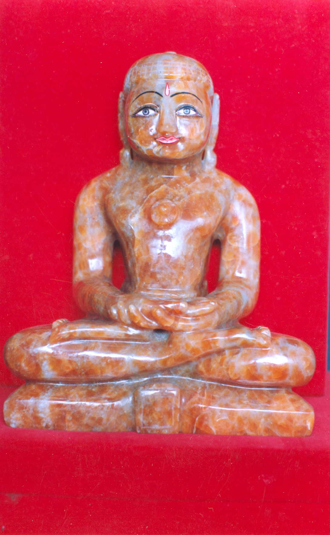A luxurious and energizing "Tirthankar" idol statue in orange. A fascinating and divine face with poised expressions characterized with well-defined eyebrows and enticing eyes and eyelashes. An absolute delight as evident by the cloudy blotches of orange and grey creates a sort of mysticism in the statue. The red on the lips and the stunning "Tilak" on the forehead add to the divineness of the statue.