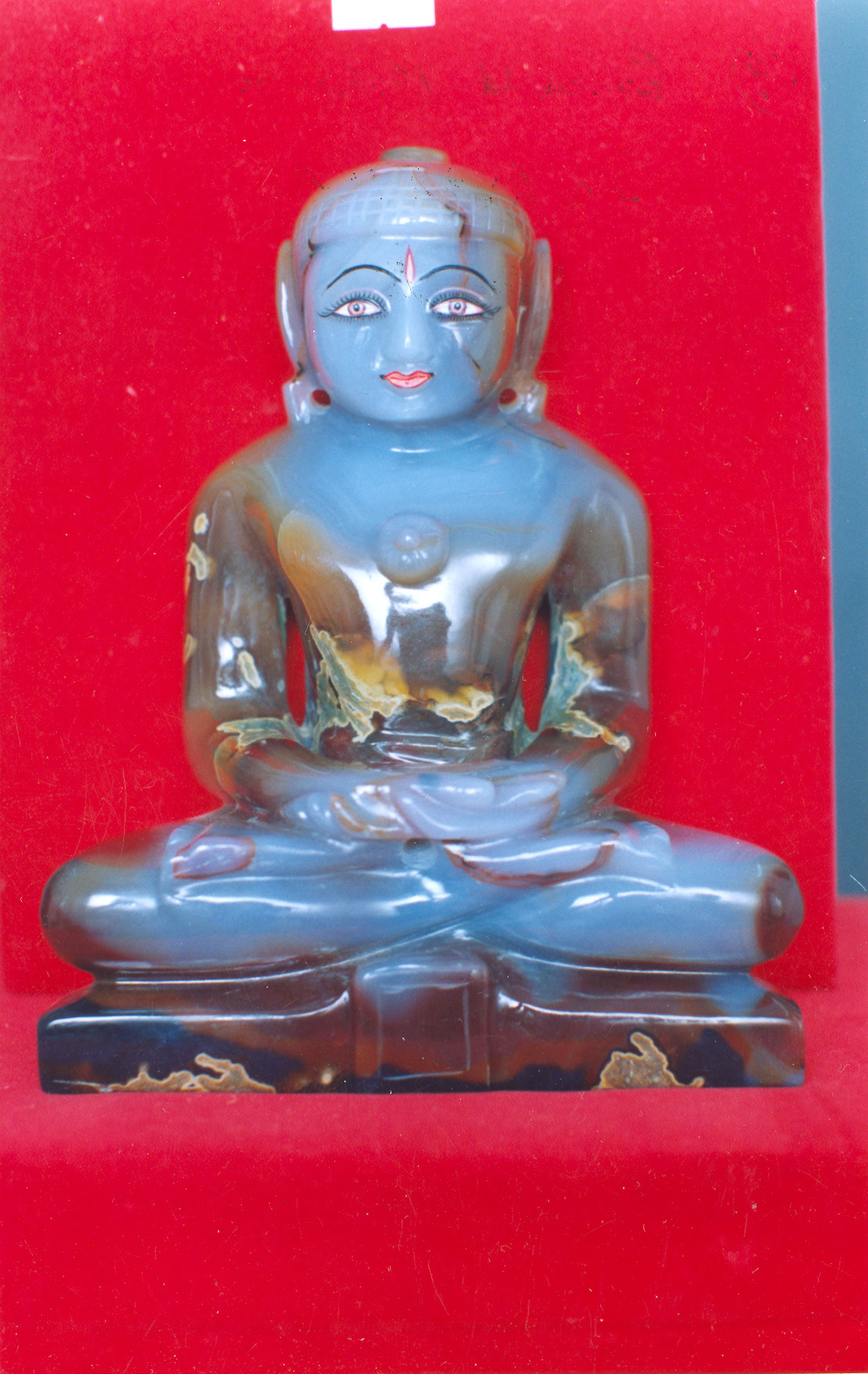 A magnificent "Pujyaniya" Tirthankar idol statue carved in a classic shaded chalcedony boulder. Exceptionally shaded hues of brown and ochre, the blue emerges out beautifully from the brown Sinhasan platform. Divine facial expressions with reddish pink tinted lips and "Tilak" add to the aesthetic appeal of the statue.
