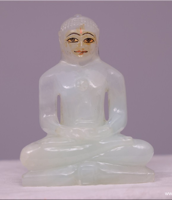 An icy blue splendor carved into an exquisite "Pujyaniya" Tirthankar statue. A well proportionate body, finely carved facial features with a raised platform lends an aura of grandeur to the statue. A fine work of art in cooling and soothing gemstone in the color of truth, nobility and serenity.