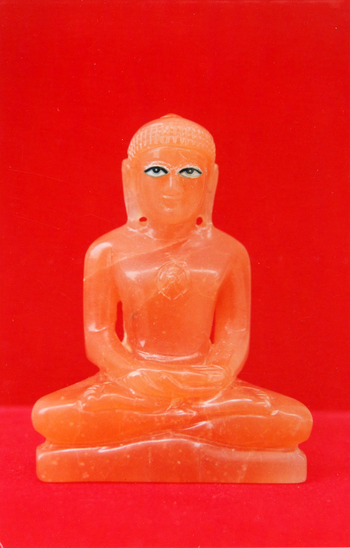 A glamorous and mesmerizing "Pujyaniya" Tirthankar idol statue in the energizing color orange. A radiant and stunning visual appeal is created by the black touch on the eyes and the two red dots on either side of the chin. Beautifully crafted facial expressions together with a well-proportioned body add to the aesthetical appeal of the idol.