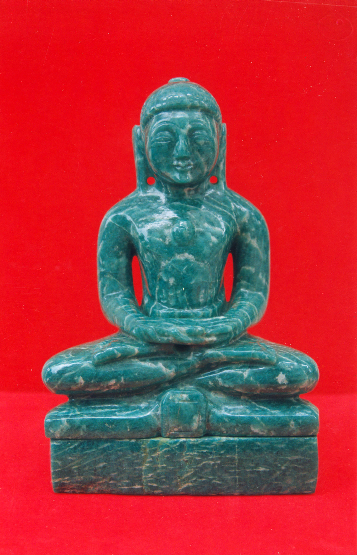 Grandiose! Grandiose! Grandiose! The feeling of elevation as felt by the presence of a double raised platform in the sensitive to pressure gemstone. Finely carved facial expressions and well-rounded arms make this a beautiful " Pujyaniya' Tirthankar idol. The turquoise green hues with greyish lines all over add a spirit of movement to the idol.