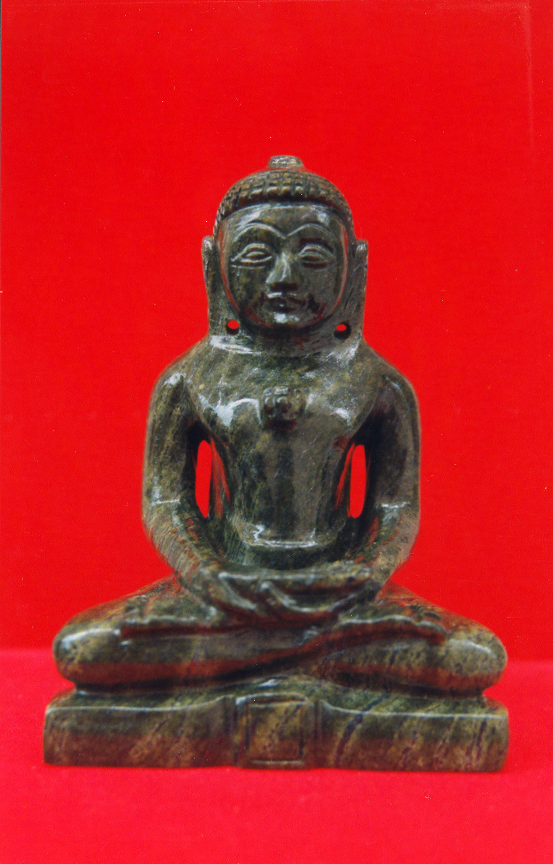 Stripes and spots…all over the body of a majestic "Pujyaniya" Tirthankar statue. Green of the olives with touches of yellow ochre combined with fine craftsmanship makes this a beautiful piece of art. "Srivatsa" symbol on the chest and calm & serene Faial expressions are the highlights of the statue.