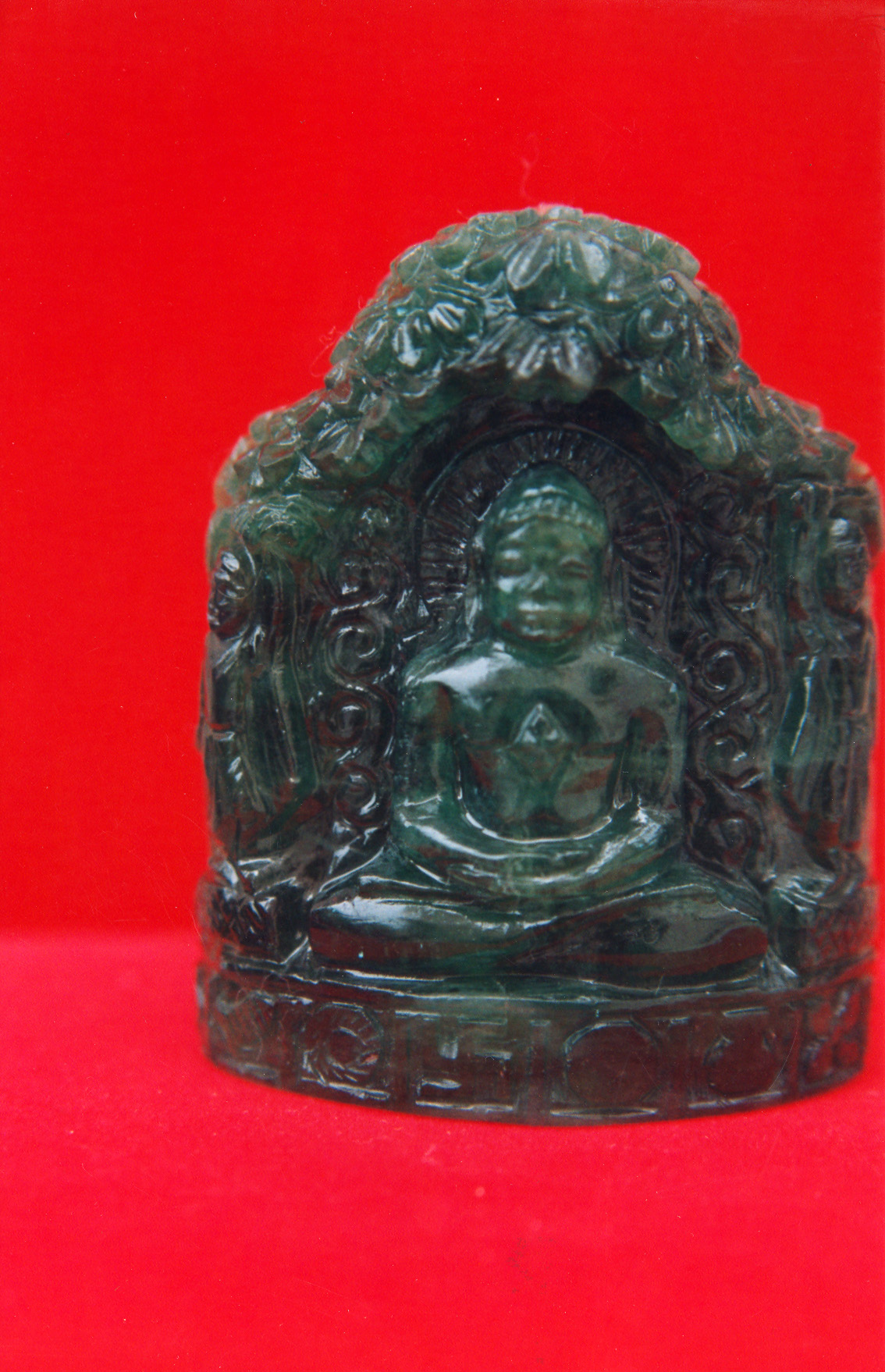 Exquisite lapidary craftsmanship evident in this masterpiece "Darshaniya" Tirthankar statue in emerald. Beautifully carved leaves together with geometrical spiral patterns in the background boldly frame the image on to the viewer. A fine "Srivatsa" symbol on the chest with a carved "Sinhasan" platform add to the mystic beauty of the statue.