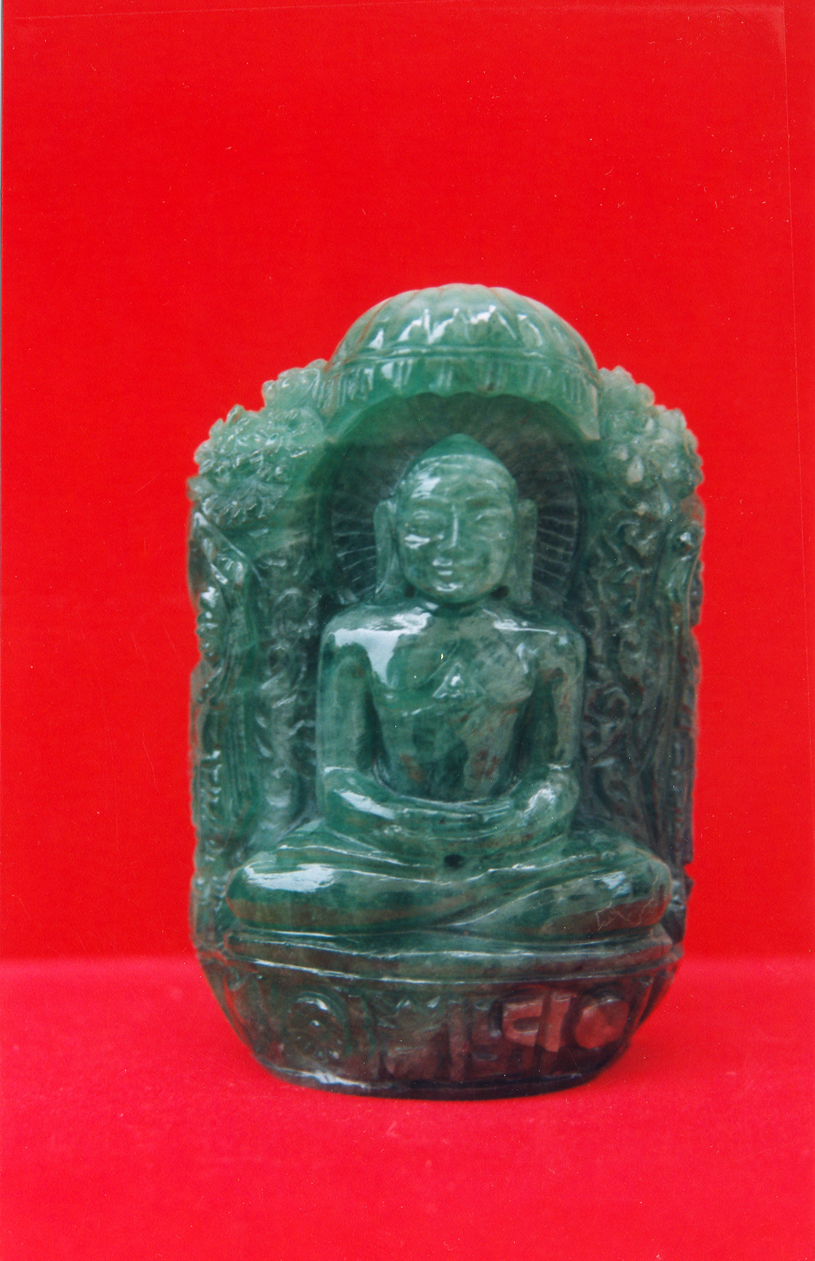 Rayed aura, a carved "Chattra" above the head together with the beautifully carved creepers and leaves are the hallmarks of this statue. A 'Darshaniya" Tirthankar statue idol with tranquil features and a super raised "Sinhasan" platform make this a colletors' piece. A classic beauty in vivid green.