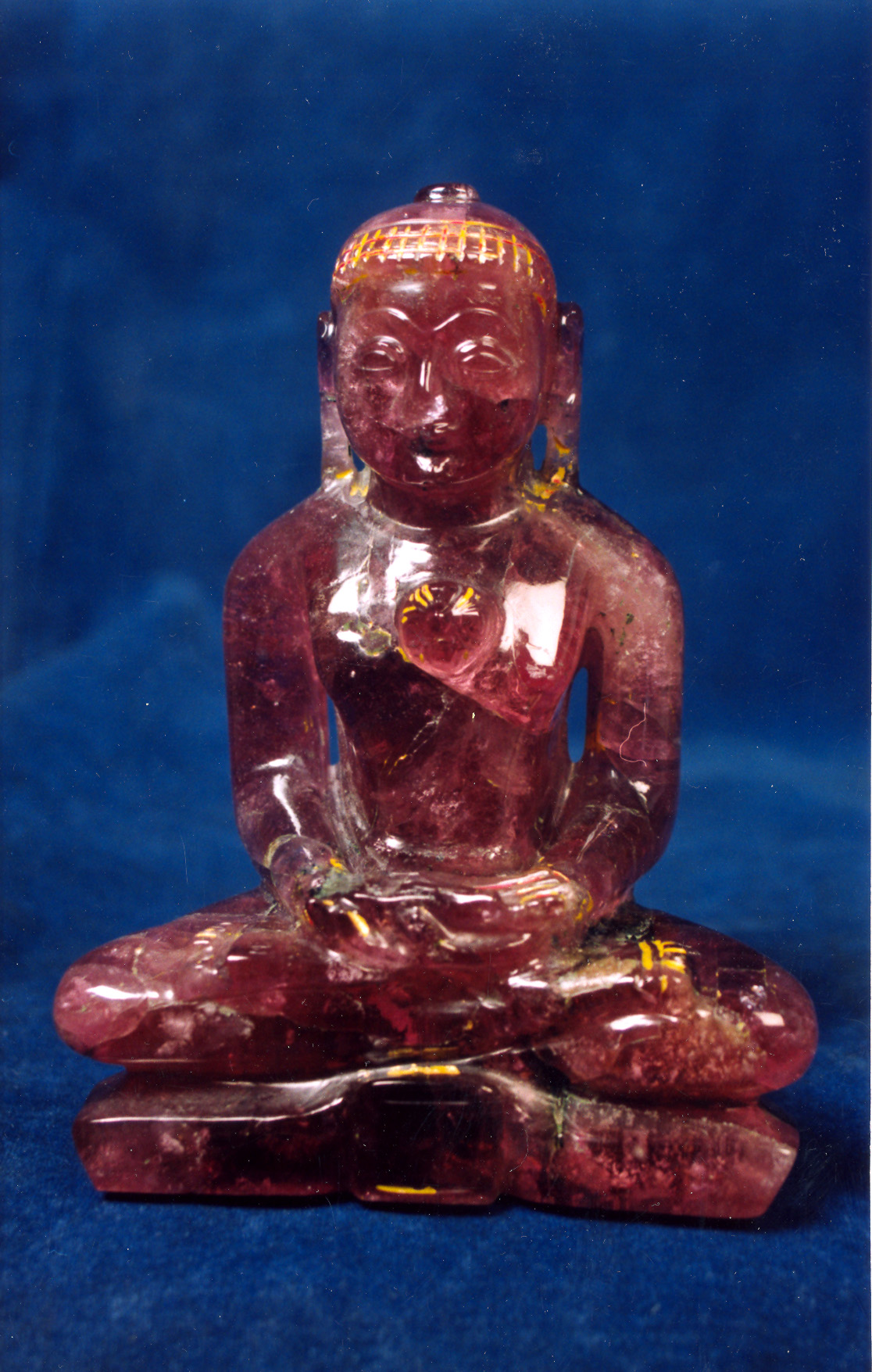 A beautiful "Pujyaniya" Tirthankar statue in the festive and serene pink of the rainbow in the gemstone called tourmaline. Well-proportioned body parts, perfect posture and fine facial expressions add to the charm of this statue.