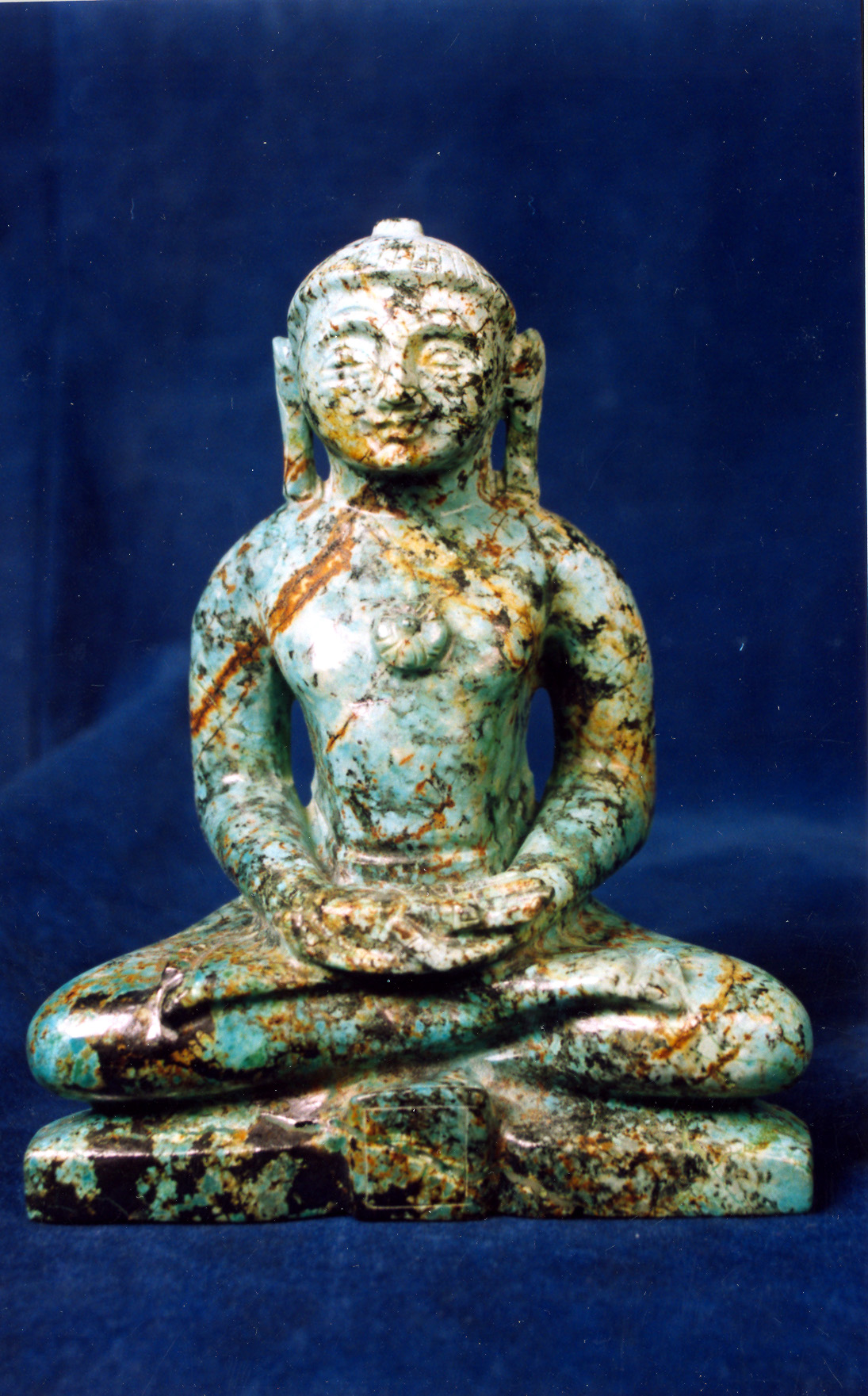 Green of the sea and blue of the sky combine to form this exquisite "Pujyaniya" Tirthankar statue in turquoise .Brown appears as if adding a textural pattern to the statue at the right places. Calm and poised expressions together with a "Sinhasan" platform add to the divinity of this statue.