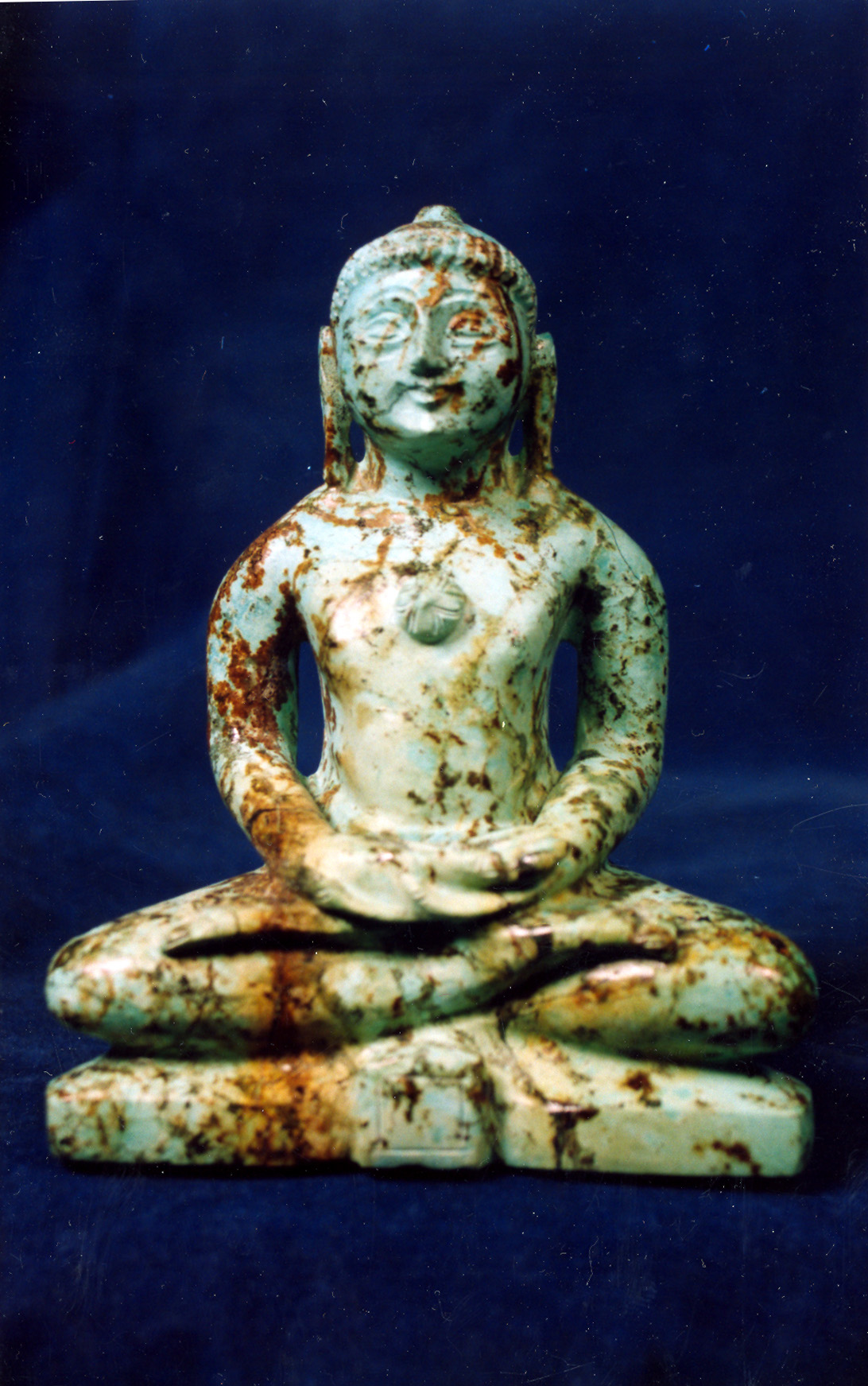 The perfect amalgamation of green and blue combined with hues of brown add and earthly tome to the "Pujyaniya" Tirthankar statue. The "Srivatsa" symbol on the chest together with a perfect posture make this a connoisseurs' piece of art.