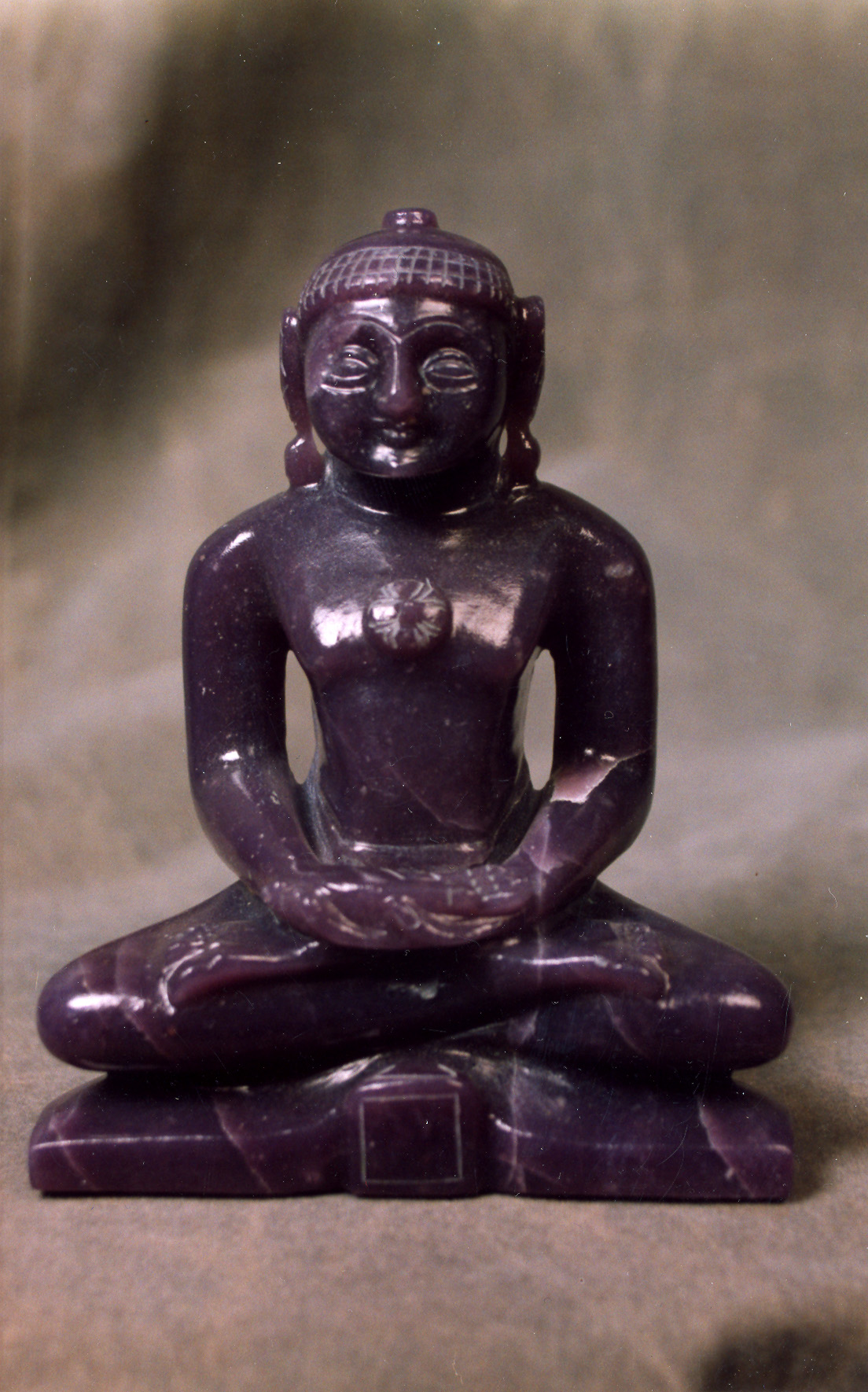 A classic and magnetic "Pujyaniya" Tirthankar statue in violet with finely chiseled features and body parts. Perfect posture of the hands and the feet combined with the "Sinhasan" platform add to divinity of the deity.