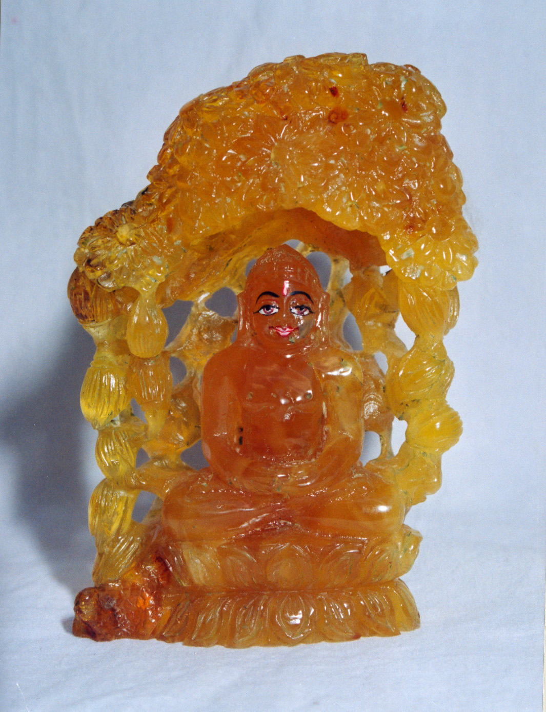 Carving stylized, this is a true masterpiece in Amber. The deity sits peacefully amidst trees and foliage providing shade. Notice the color contrasts where the deity stands apart from the background. Well carved from the back too, it’s a delight to the eyes of the beholder.