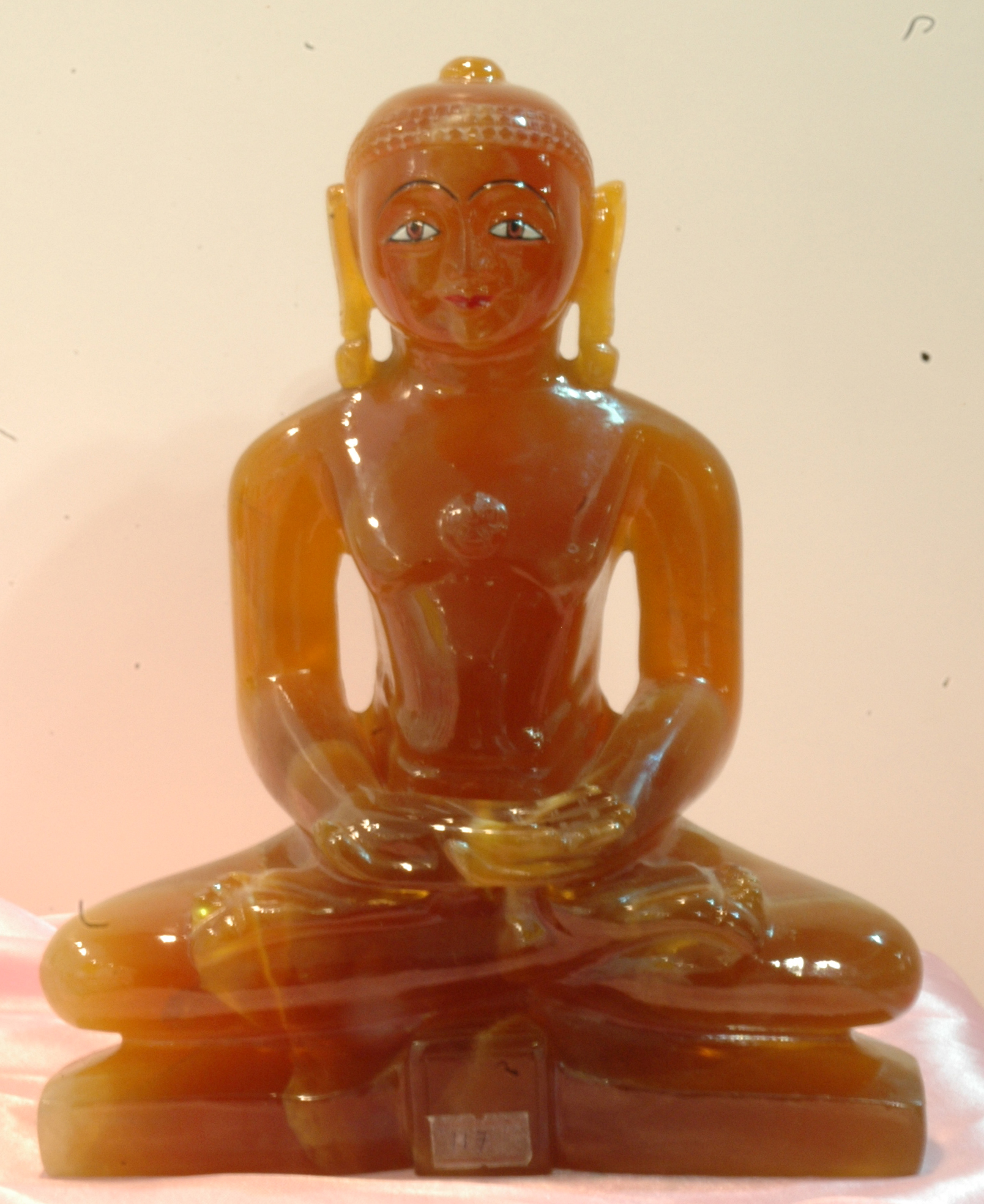 An energizing "Pujyaniya" Tirthankar statue in the warm hue of the sun, orange. Exemplary workmanship has been attained by the lapidary in such a soft stone like fluorite. Divine facial expressions together with brilliant body proportions make this a connoisseur piece.