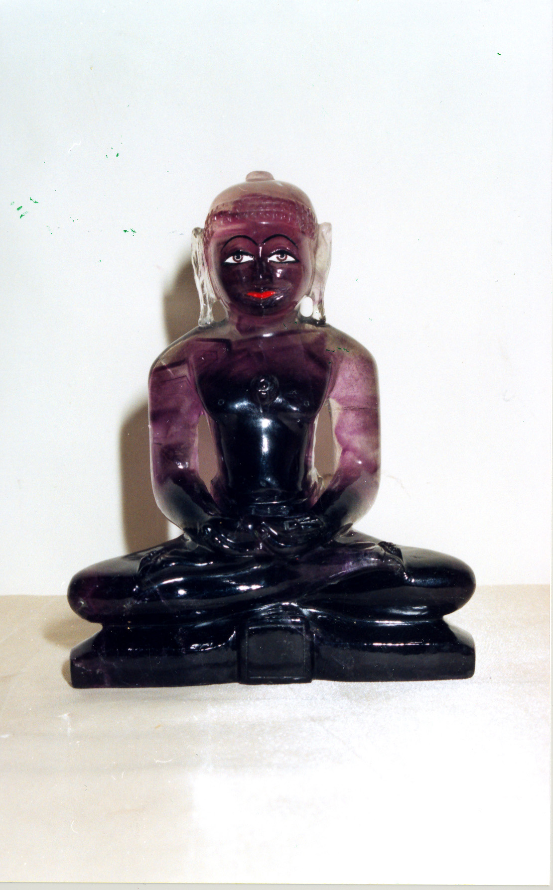 A magnetic and mystic beauty carved in the purple rock of fluorite. Well chiseled facial expressions have been well highlighted with black and red. Classic body proportions, well poised features and a classic color amalgamation make this a unique creation in gemstones.