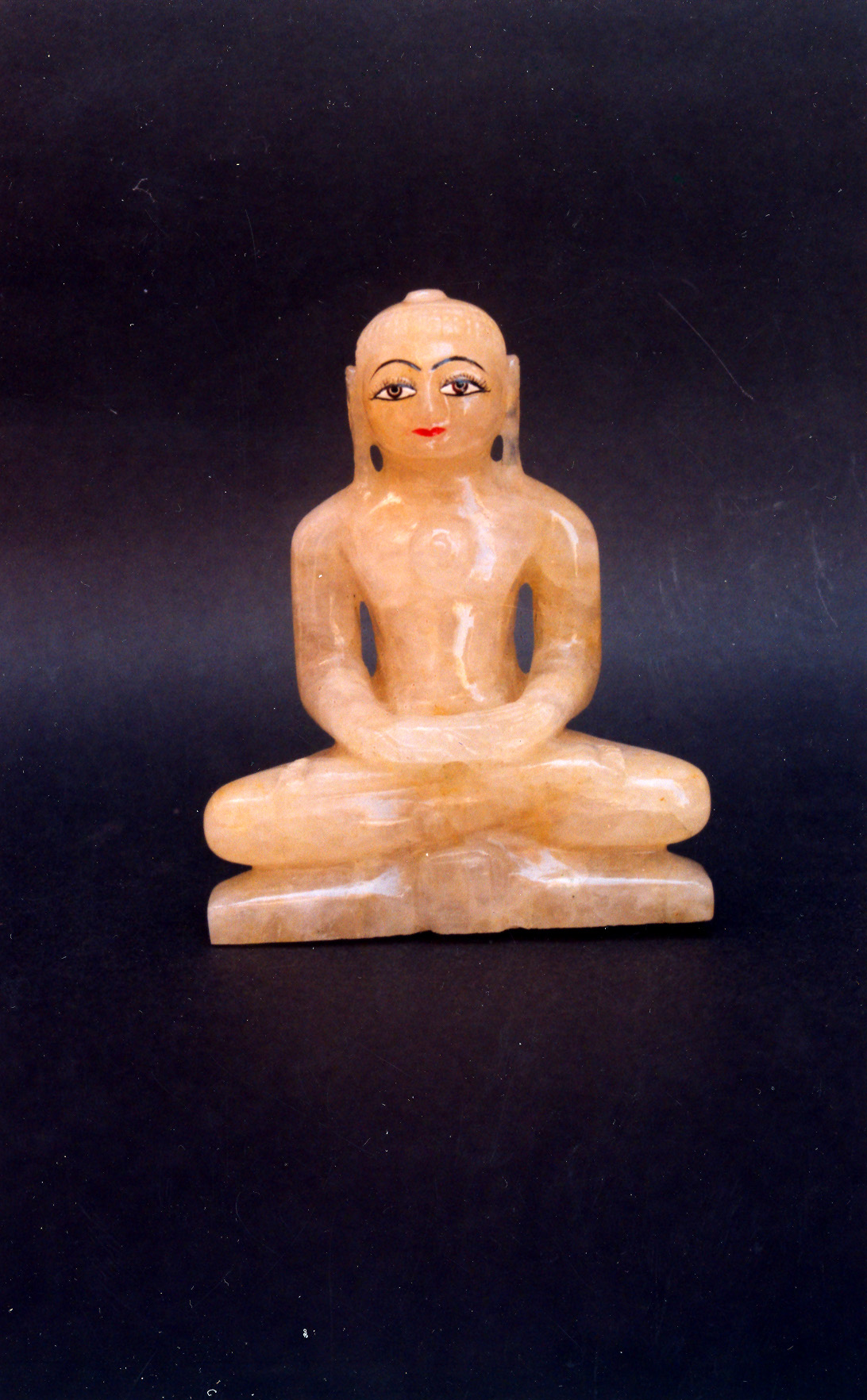 A majestic and refreshing piece of art carved in the golden yellow of Quartz. Finely marked eyes in black together with the red accent on the lips create divinity on the face. Perfect "Padmasan" posture and a raised "Sinhasan" platform add to the enlightening creation.