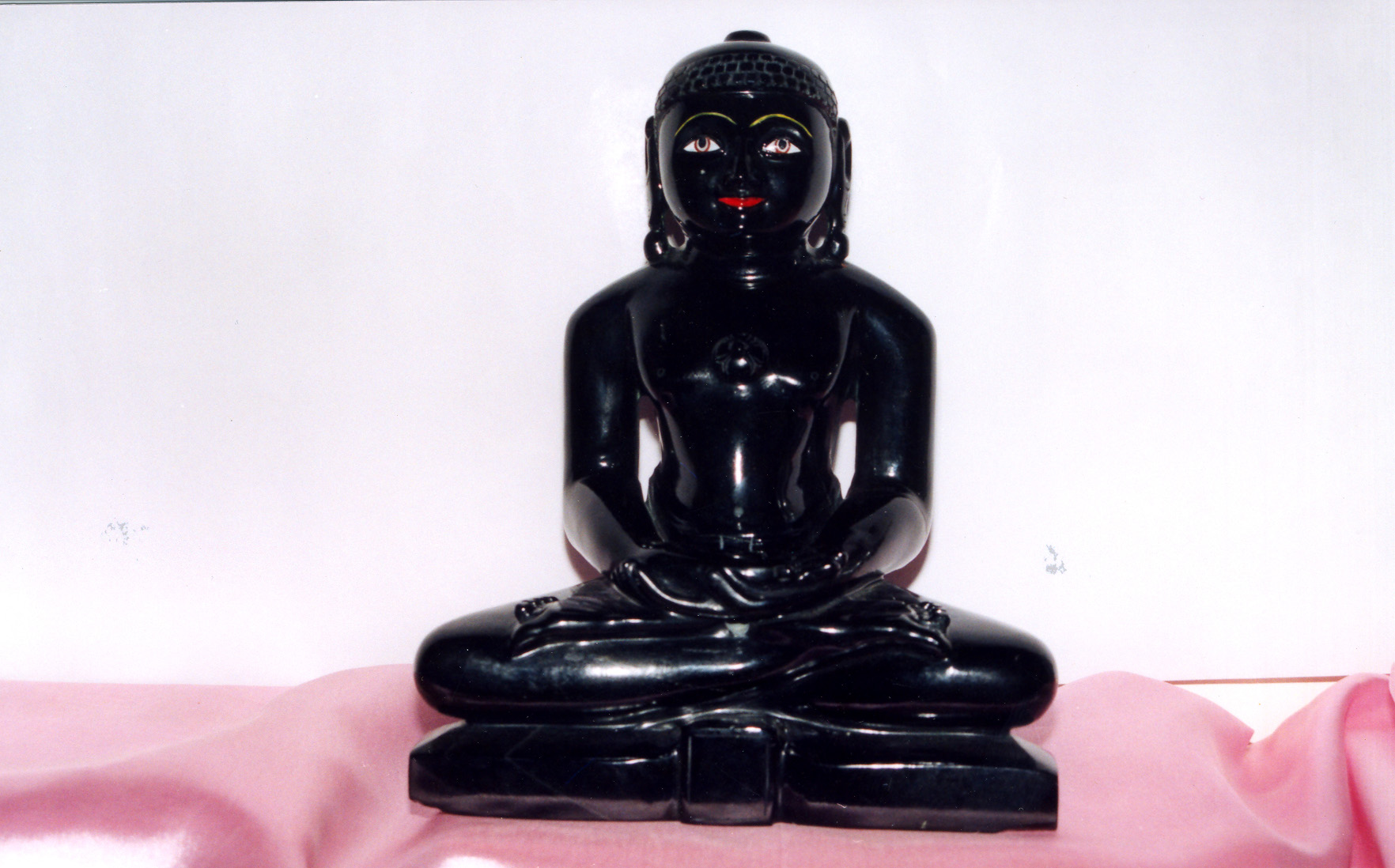 Creatively shaded and striped by nature, this banded beauty and in black has been transformed beautifully into a "Pujyaniya" Tirthankar statue. Perfect body postures and proportions, highlights in yellow and red add to this lustrous example of supreme god.