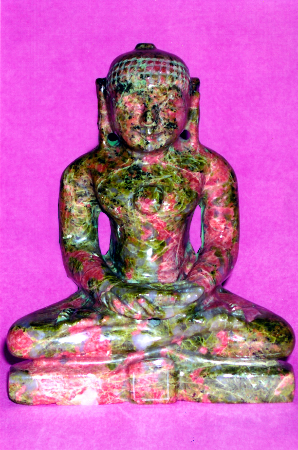A multi colorful extravaganza with green and pink highlights carved into a stunning "Pujyaniya" Tirthankar statue. Classically spread textures all over the statue make it look like a natural and scenic panorama in stone. Exquisite lapidary craftsmanship adds to this very attractive statue.