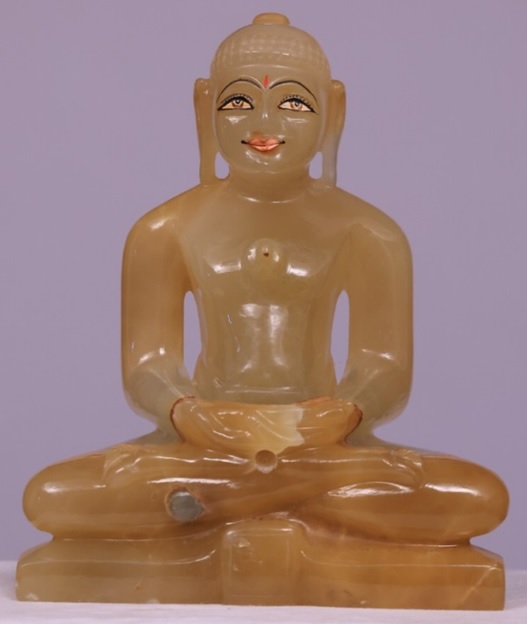 An amalgamation of riot in colors in a serene yellow red spotted Onyx "Pujyaniya" Tirthankar statue. Beautiful natural shading of colors makes this statue a collector's piece along with its classic and mesmerizing facial expressions.