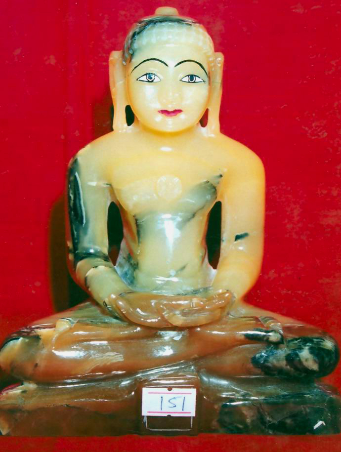 An amalgamation of riot in colors in a serene yellow red spotted Onyx "Pujyaniya" Tirthankar statue. Beautiful natural shading of colors makes this statue a collector's piece along with its classic and mesmerizing facial expressions.