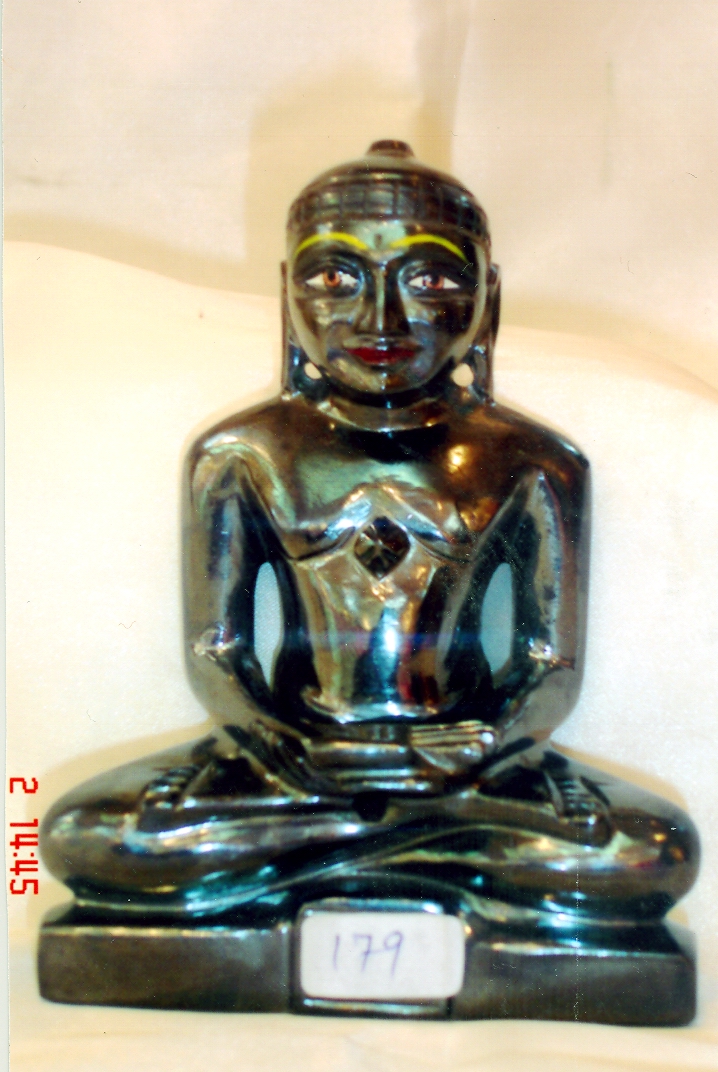 The dark grey of gun metal with its stupendous luster makes a classic "Pujyaniya" Tirthankar statue. Finally chiseled features and a very well proportionate body together with the "Srivatsa" symbol on the chest add to this harmonious piece of art.