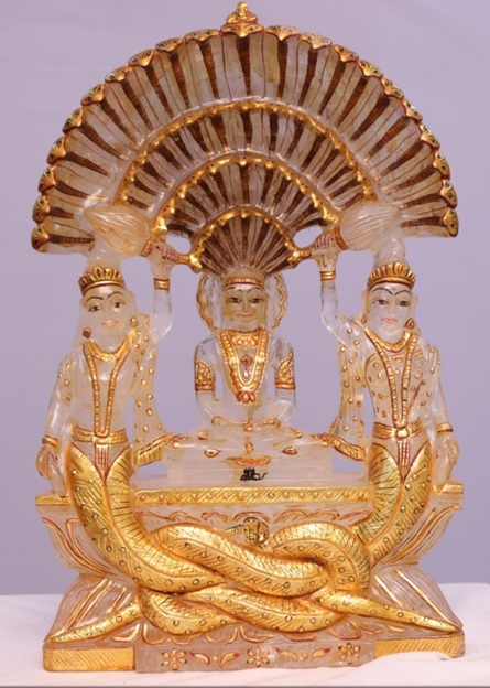 An exquisite carving of the" Sahastrafana Parshwanath" with the main idol seated comfortably and covered by the fangs of a snake. Dharnendra and Padmavati are carved beautifully beside the deity on a beautiful lotus pedestal.