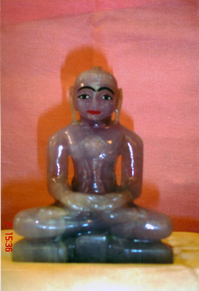 A white blue Jade rock transformed magnificently into a "Pujyaniya" Tirthankar statue. Facial expressions are cam and highlighted by the black and red accents. A truly magnificent "Padmasan" posture adds to the supreme beauty.