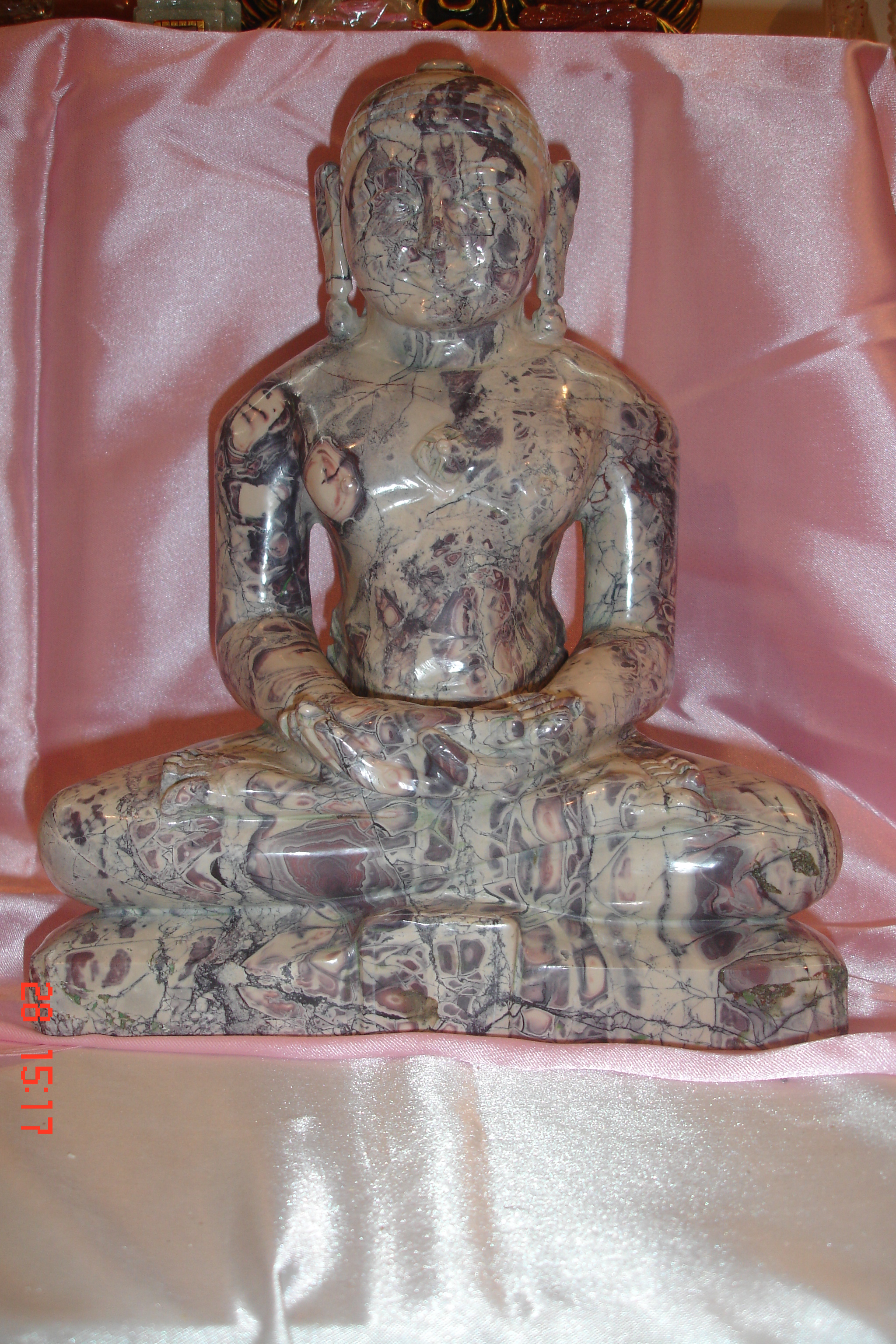 Spotted Jasper transformed into a majestic "Pujyaniya" Tirthankar statue. An elevated look lent by the "Sinhasan" platform adds to the divinity along with the religious "Srivatsa" symbol on the chest.