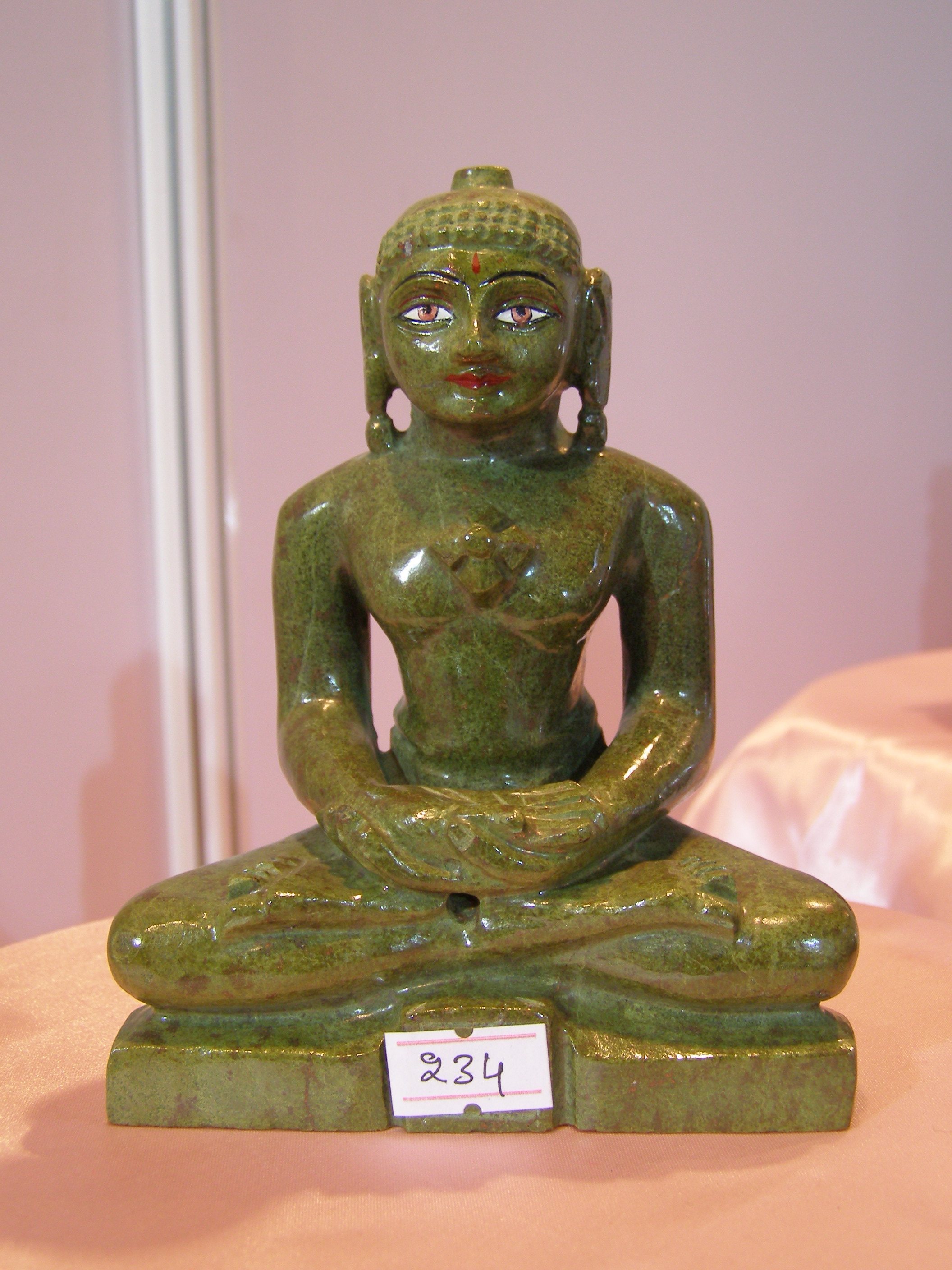 A green shaded Copper Ore statue carved intensely. The face is as divine as the exquisite eyes. Hands folded in prayer along with a perfect "Padmasan" posture. All in all, a great piece of art indeed.