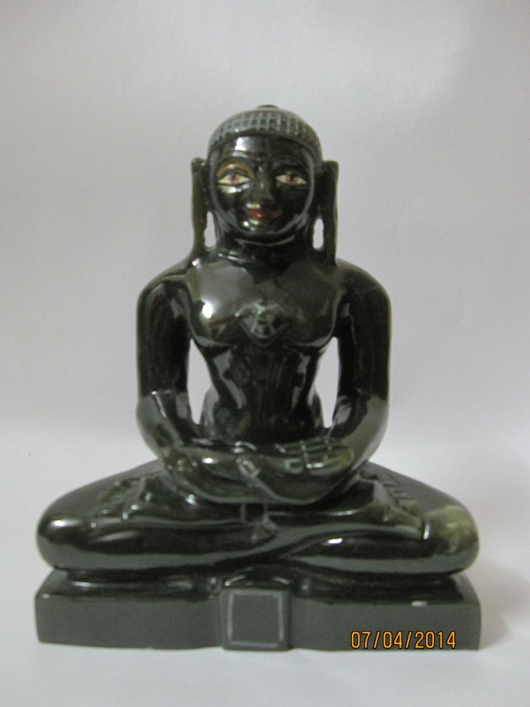 A black Omphacite statue transferring very calm and serene feelings to the spectator. Hands and legs folded in prayer, a perfect "Padmasan" posture on the "Sinhasan" platform add grace to the charismatic statue.