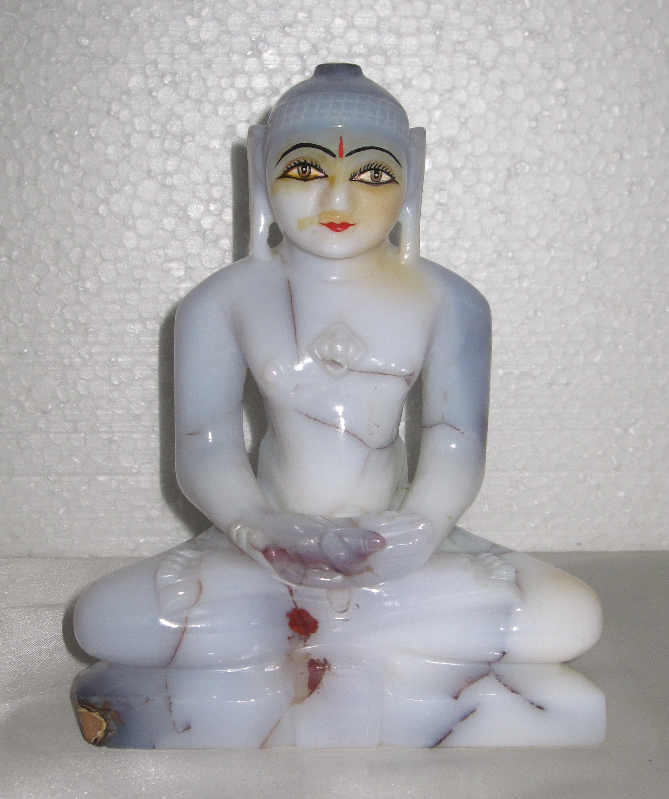 A white and violet Chalcedony statue with yellow hues around the face and neck, adding a mysterious aspect to the Tirthankar. Hands folded divinely in prayer. The body proportions are accurate. Face is very calm and composed.