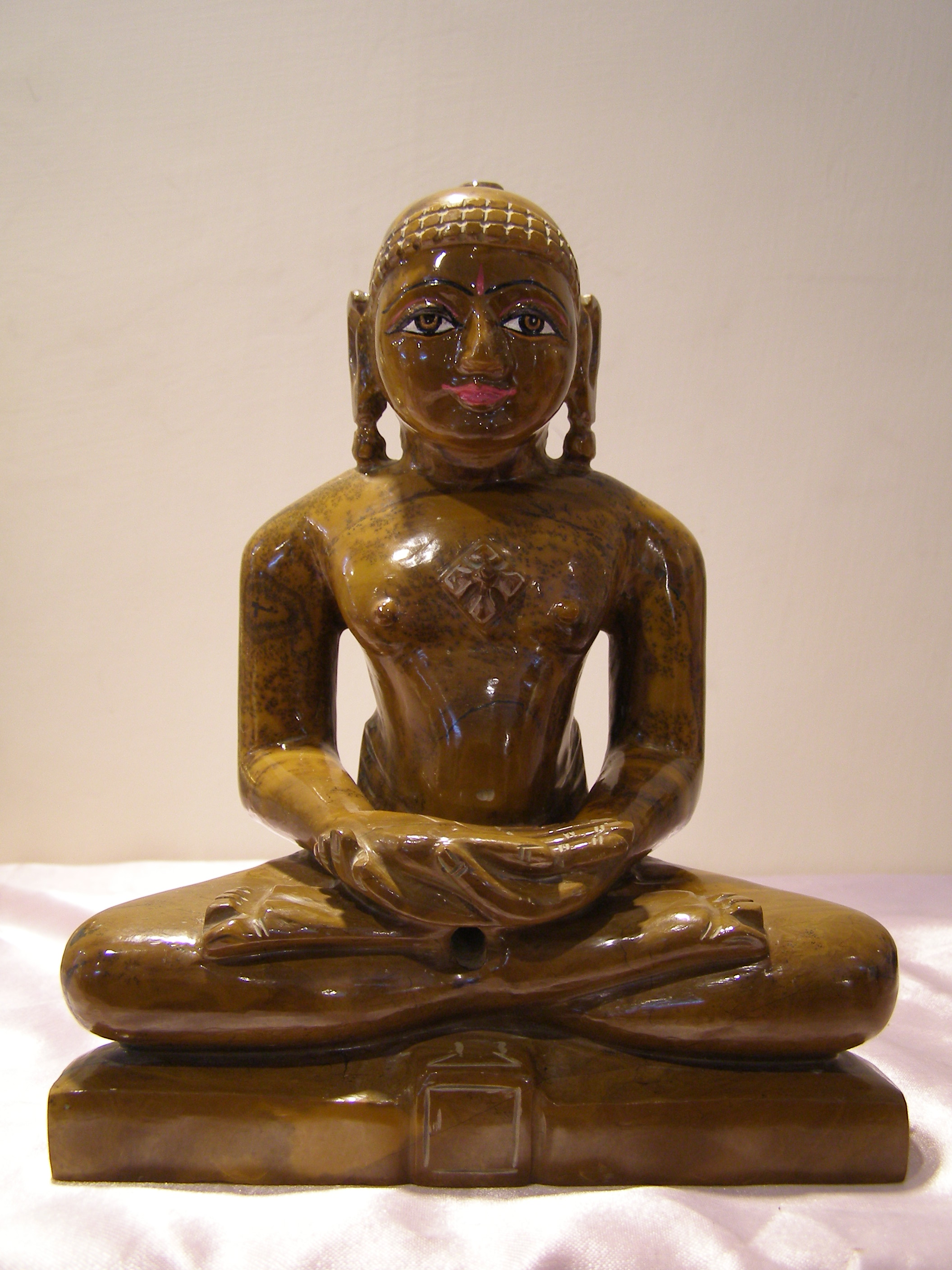 An alluring red Tirthankar statue in the phenomenal Tiger's eye. A very well defined "Srivatsa" symbol on the chest adds mysticism to the statue. Hands are folded at ease beautifully. Some colored highlights on the face add grace to the statue.