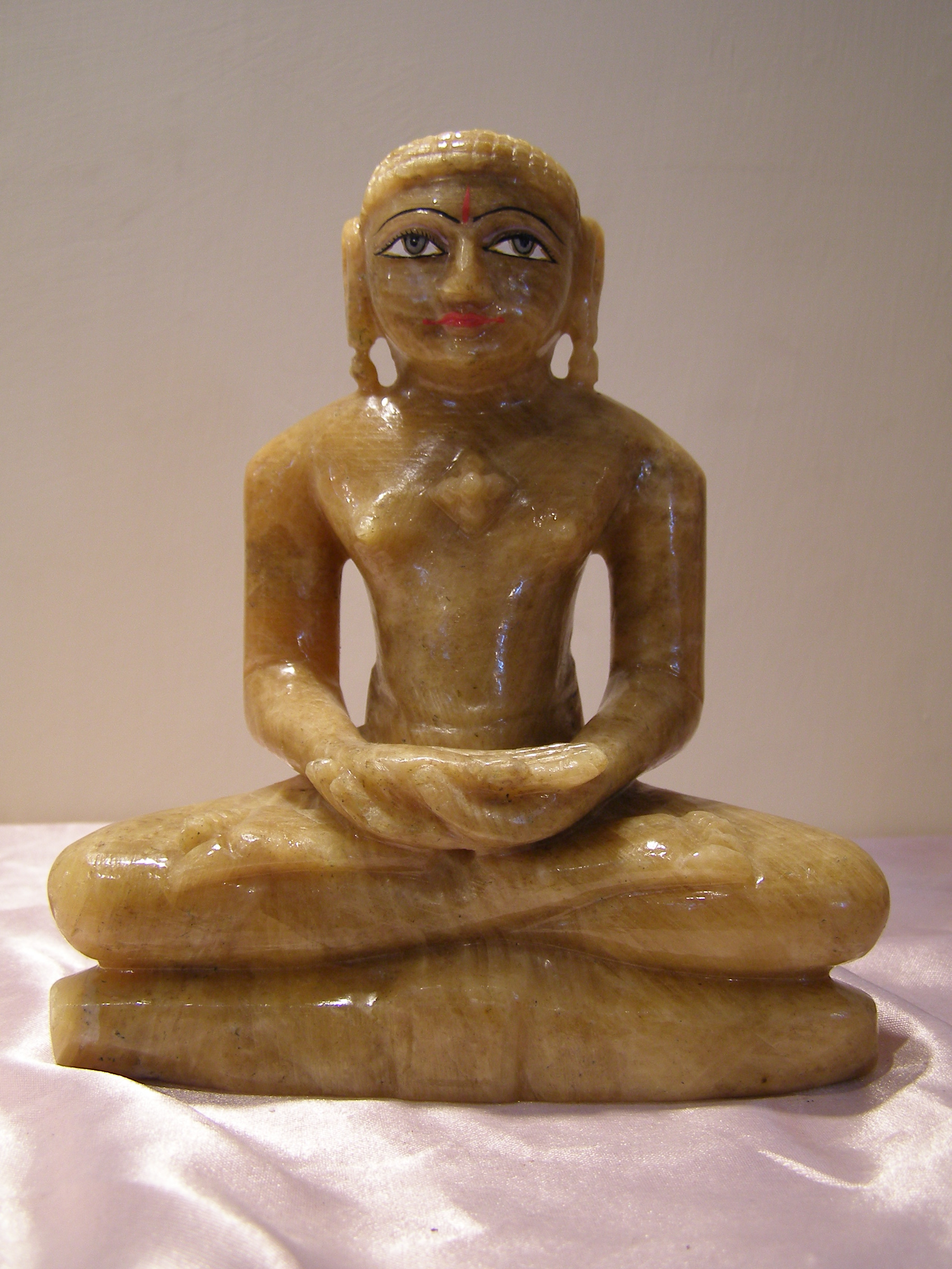 A pristine yellow opal Tirthankar statue accented with red on the lips and the forehead "Tilak". Hands folded in prayer and the deity is seated in a perfect "Padmasan" posture. Facial expressions are calm and poised.