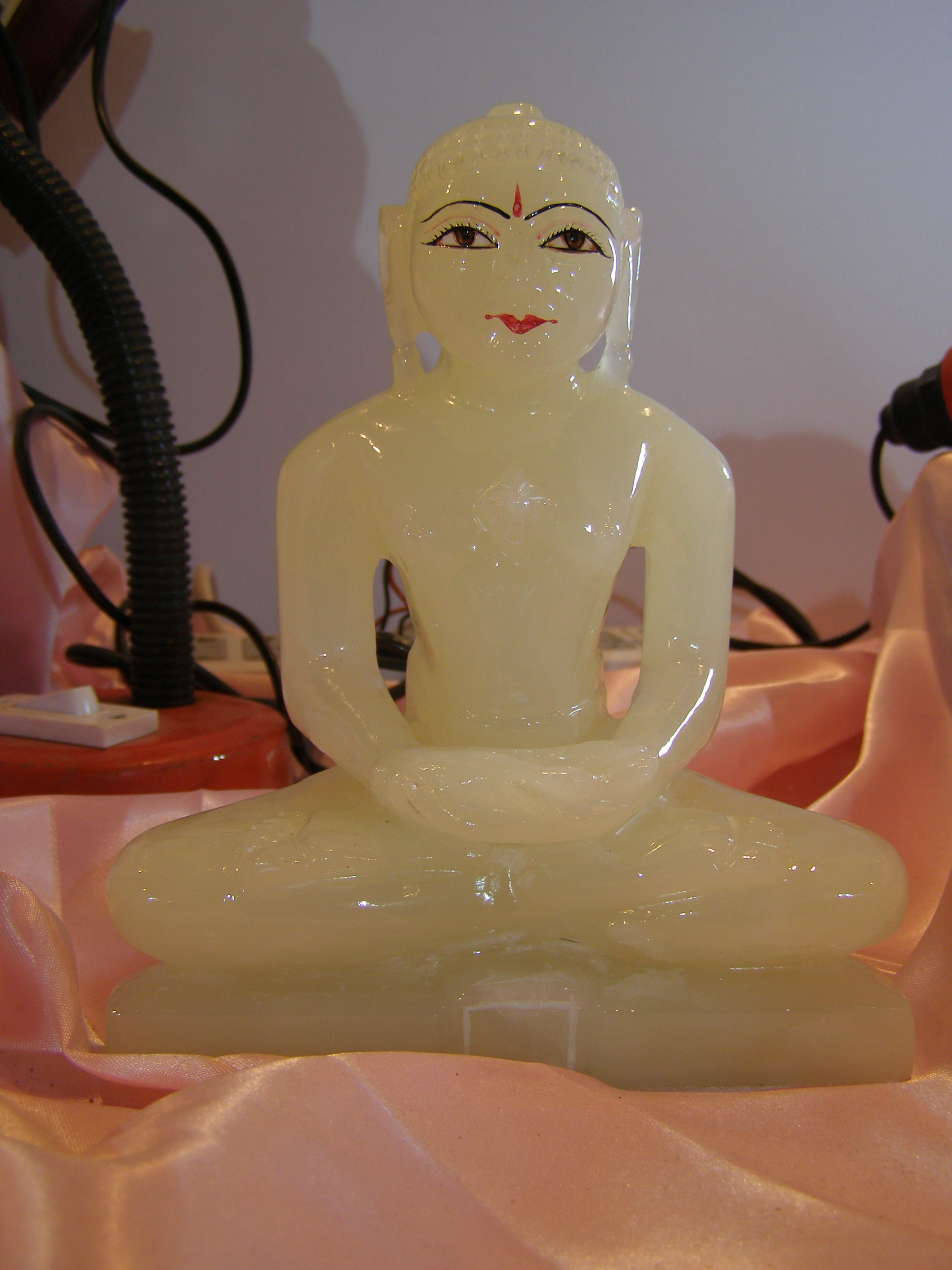 A lustrous and enlightened Creamish Tirthankar statue in Onyx. A classic example of fine lapidary craftsmanship and skill as seen in the perfect "Padmasan" posture & calm and composed facial expressions.