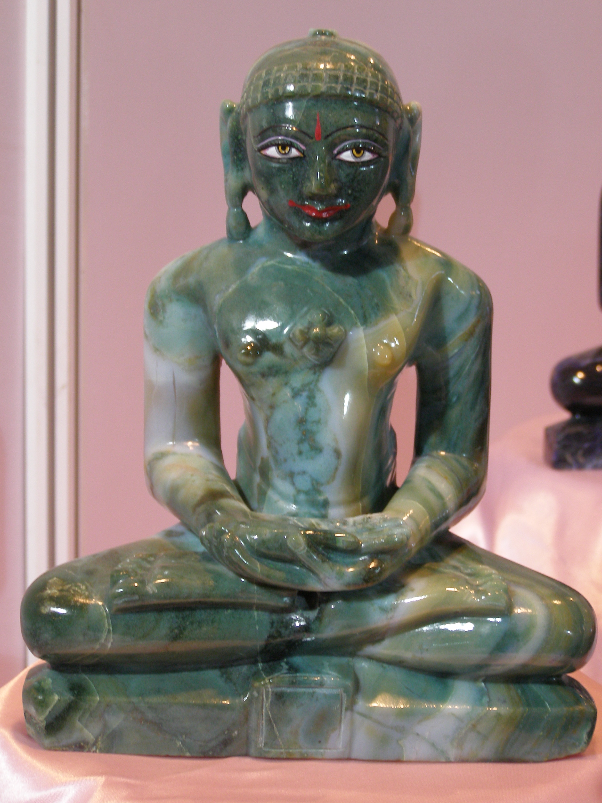 A multicolor Ocean wave Jasper in amazing luster and sheen. This ornamental landscape rock is exquisitely transformed into a magnificent "Pujyaniya" Tirthankar statue. Classic body proportions add to the divine facial expressions.