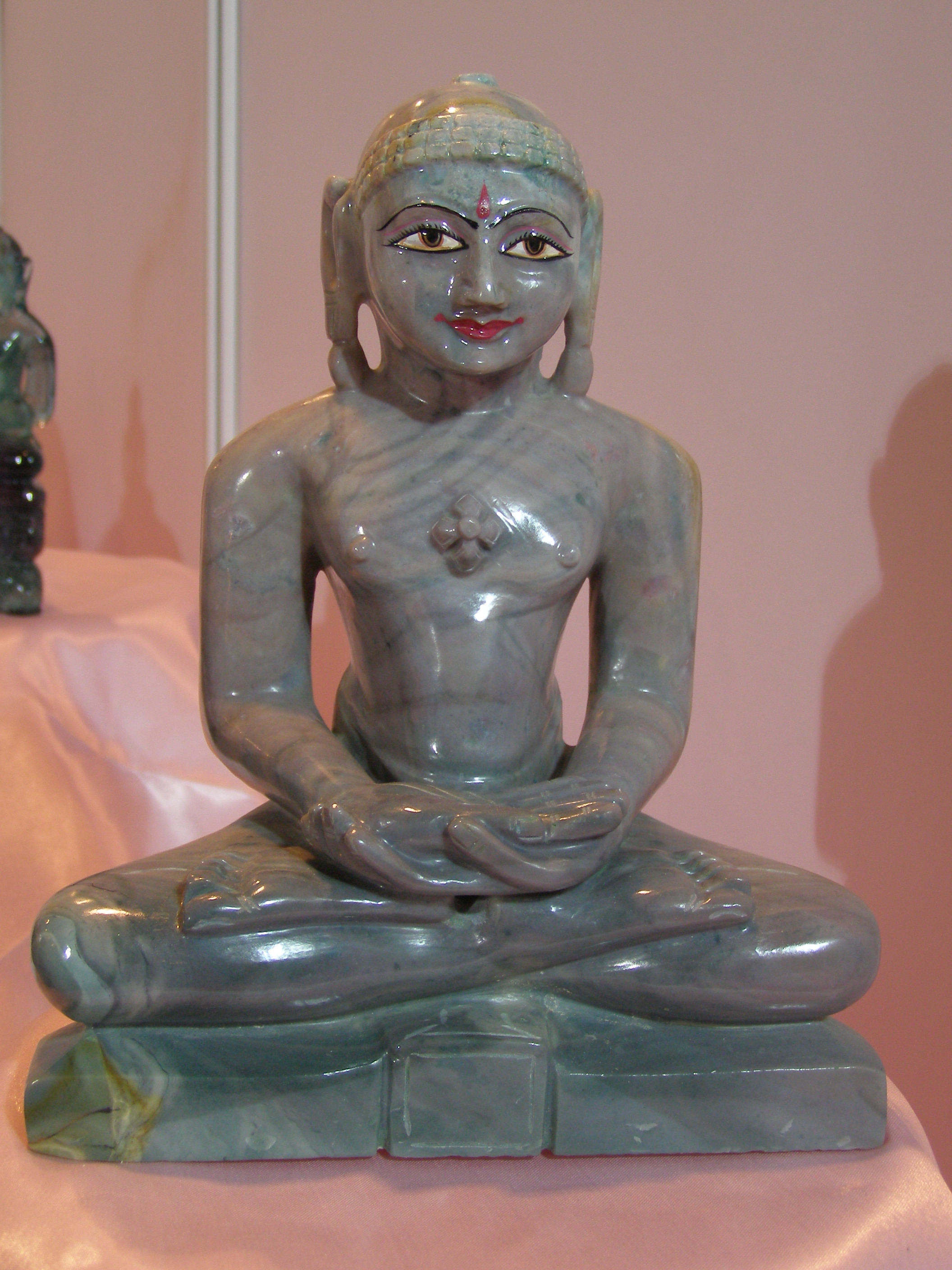 Multicolor bands and patterns in this Ocean wave Jasper. Classic amalgamation of hues carved beautifully into this "Pujyaniya" Tirthankar statue. Very expressive eyes accented with black along with the red "Tilak" and lip color add grace to the face. Body proportions are very well coordinated.