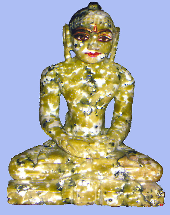 A green yellow spotted Lizardite carved into a mesmerizing "Pujyaniya" Tirthankar statue. A perfect "Padmasan" posture, the symbolic "Srivatsa" on the chest together with the elevated "Sinhasan" platform add beauty to the enlightened soul.