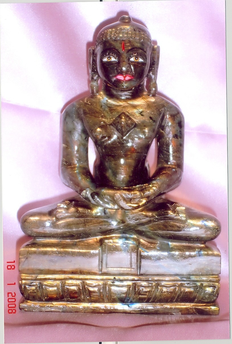 A sparkling gold black "Pujyaniya" Tirthankar statue in Labradorite The face is placid as an enlightened soul's and a high "Sinhasan" platform adds elevation to the statue. Hands are folded in prayer together with a well-proportioned body.