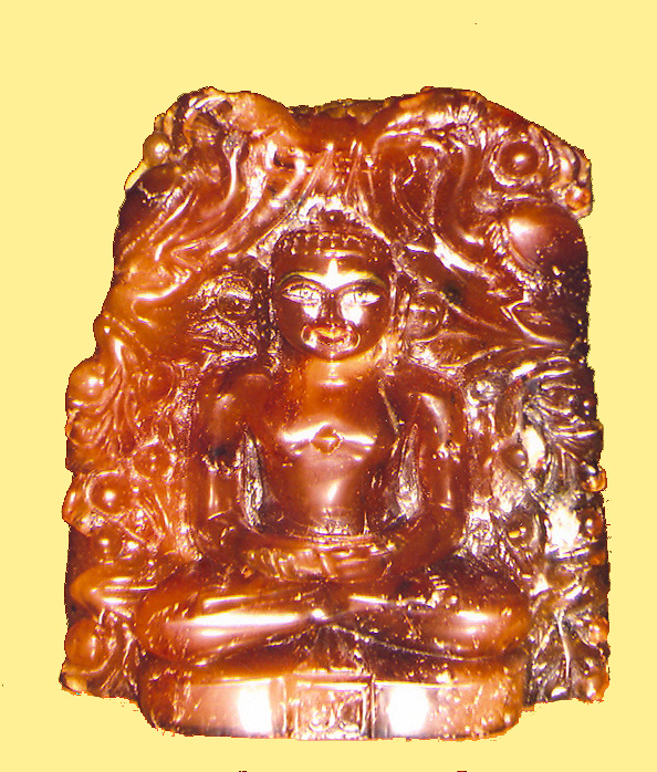 A blackish brown "Darshaniya" Tirthankar statue in Copal. Beautiful ornamental carvings around the deity add a classic aesthetic value to the statue. The facial expressions are very expressive and well defined.