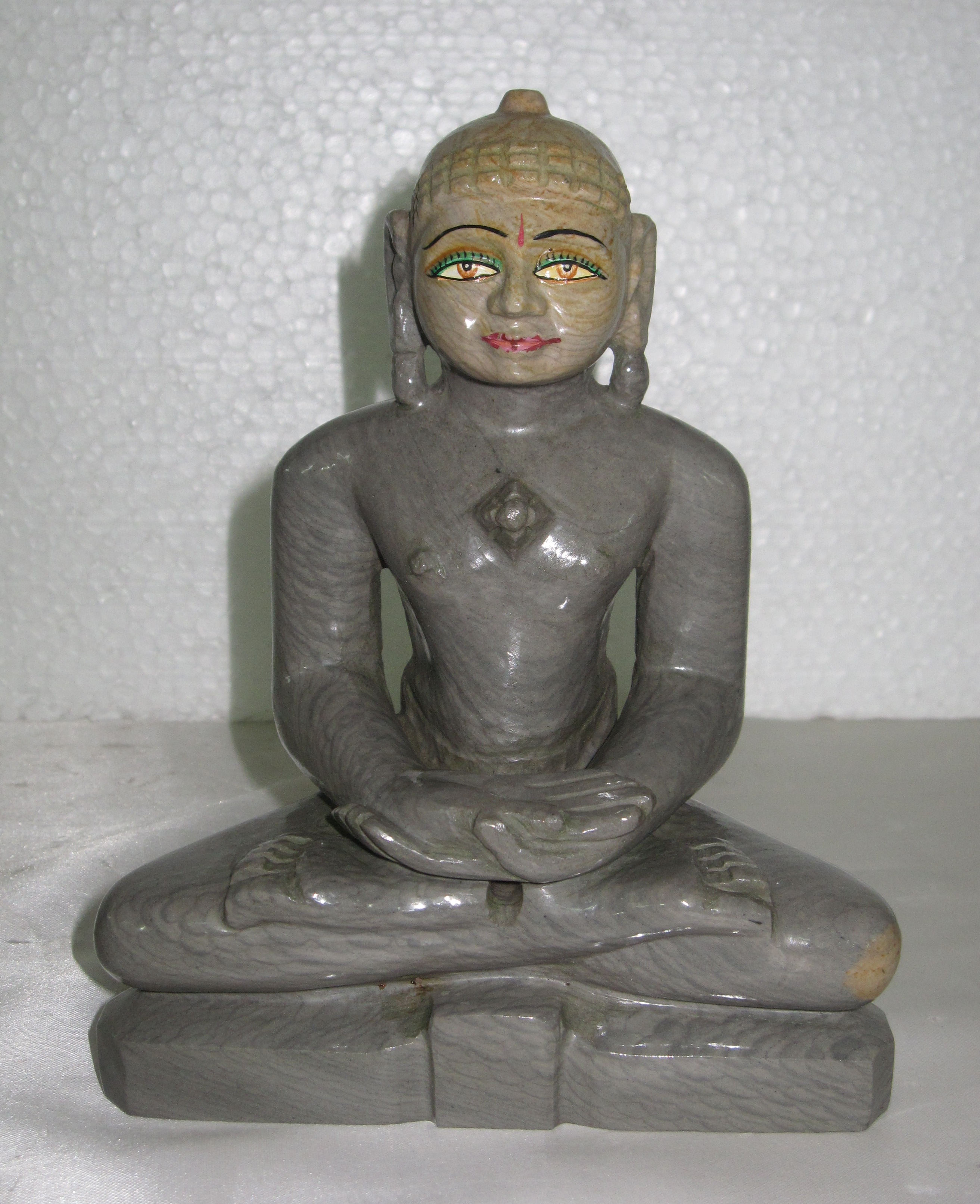A brownish grey Flintstone statue seated calmly on a magnificent "Sinhasan" statue. The eyes seem mesmerized in prayer and well accented eye lashes in green and red of the lips lend color to the statue.