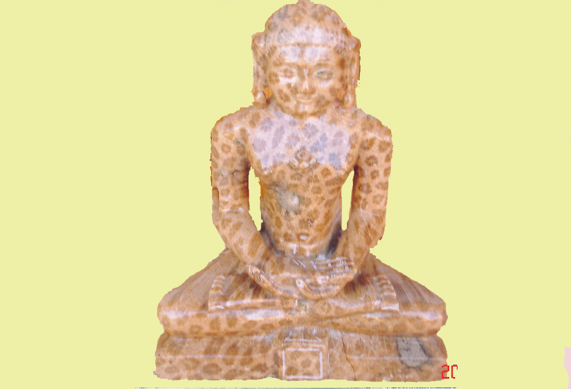 A spotted brown petrified wood statue carved beautifully by the lapidary. The chest is highlighted by the "srivatsa" symbol on the chest.Hands are folded in prayer with hands placed on each other.