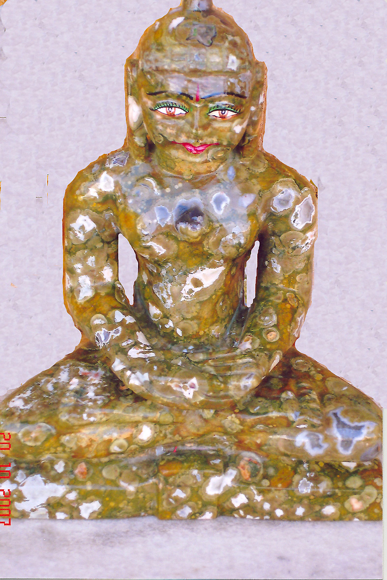 A magnificent spotted Jasper Tirthankar statue in green and white. Beautiful highlights on the face with pink and aqua together with the vibrant "tilak" add to the calm and serene facial expressions. The perfect "Padmasan" posture adds to the magnificence of the deity.