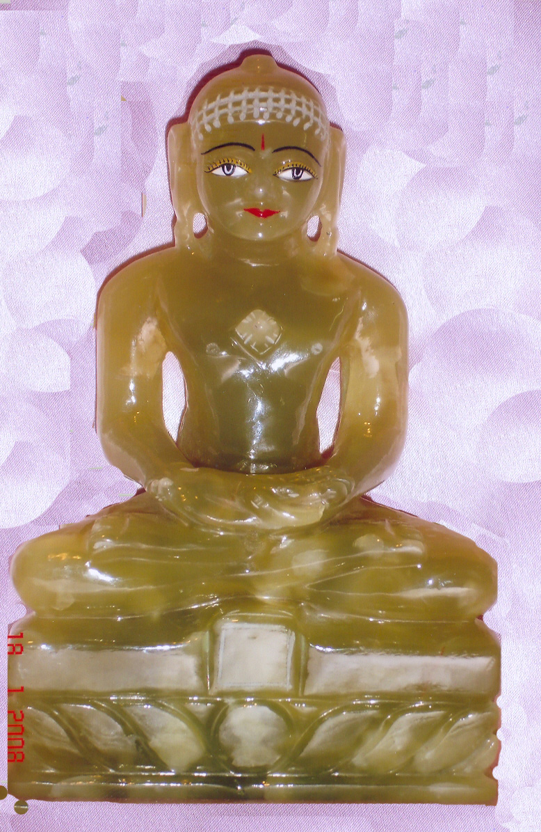 A Khaki Tirthankar in the splendid gemstone, Onyx. Splendid facial expressions and with slight accents on the face add to the serenity of the statue. A lotus platform on which the deity is seated comfortably is carved beautifully. A classic piece of art indeed.