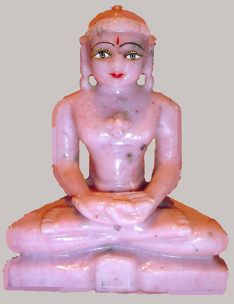 A divine salmon pink Tirthankar statue carved with magnificence and splendor. A perfect Padmasan posture highlights the Srivatsa symbol on the chest together with perfectly folded hands and legs. A classic piece of art indeed!