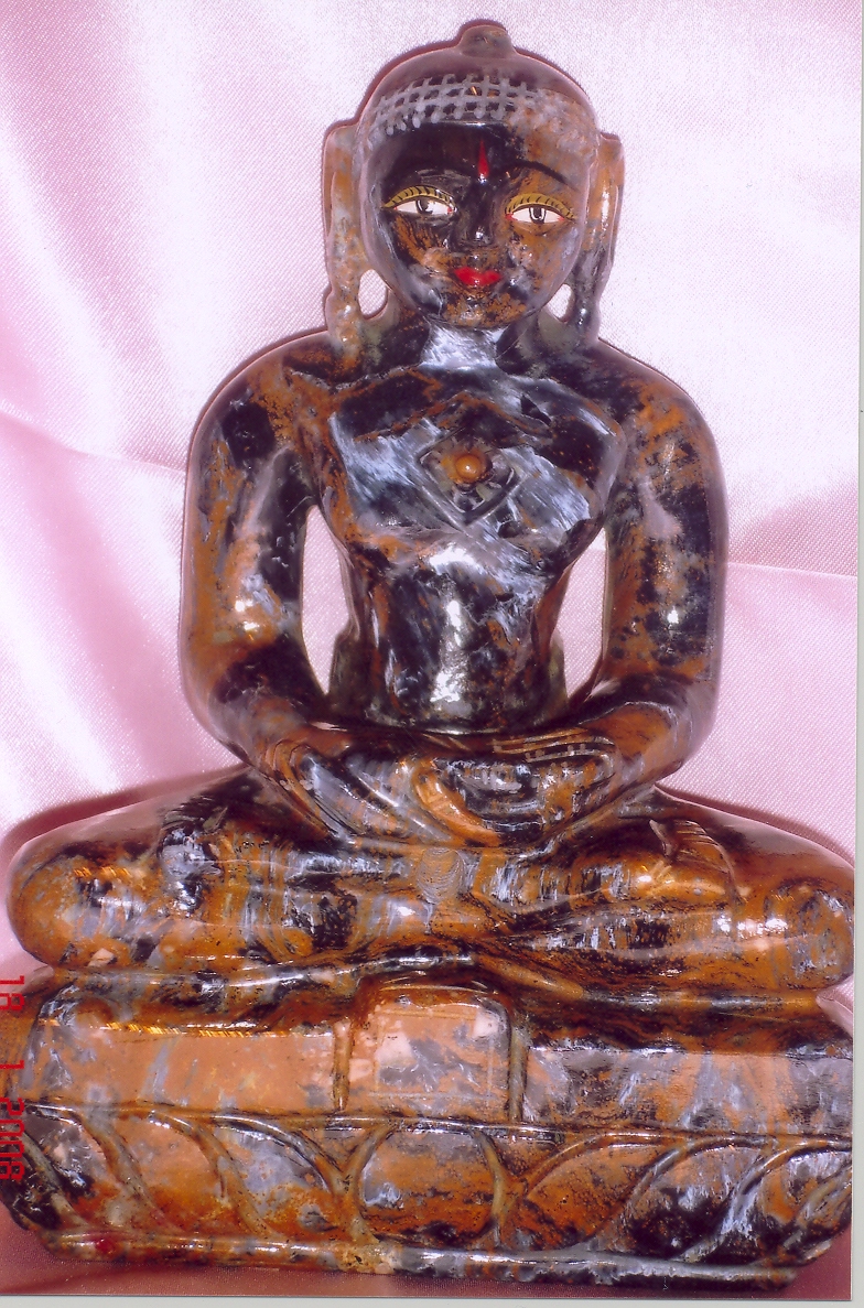 An alluring and brilliant Tirthankar statue in Pietersite. The platform with a fascinating lotus adds to the charismatic statue. Facial expressions are very calm and poised with few accents in color. The "Srivatsa" symbol on the chest adds to the aesthetic beauty of the Tirthankar.