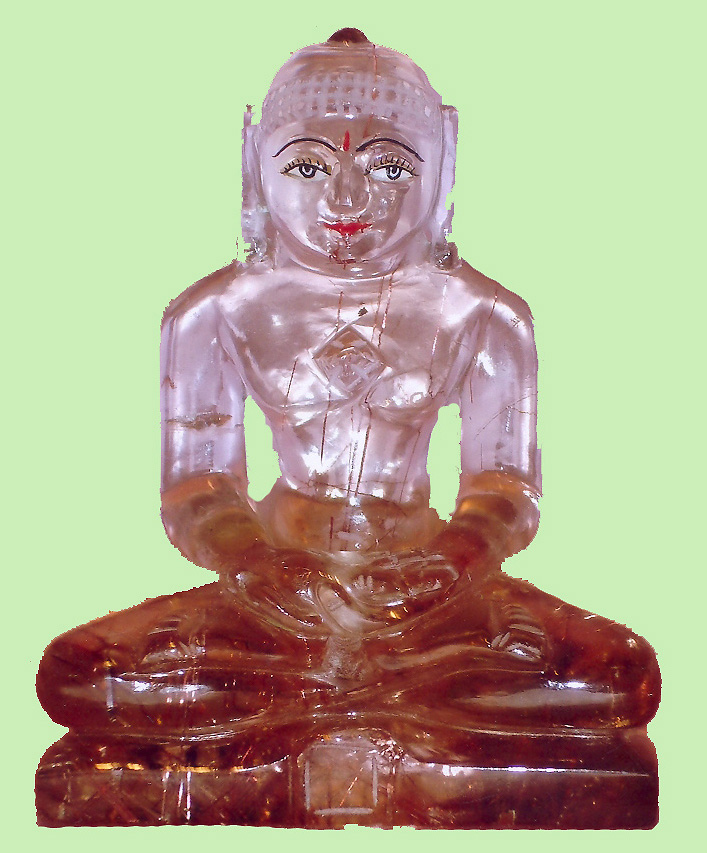 Copper streaks in Rutilated quartz add brilliance to the statue. The face is divine and eyes and lips are carved with exceptional perfection. Hands are folded in deep meditation and all in all, a great piece of art.